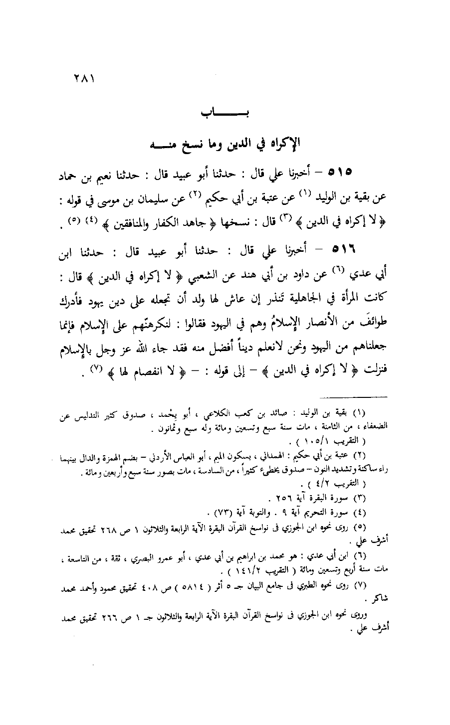 516 - أخبرنا علي قال: حدثنا أبو عبيد قال: حدثنا ابن أبي عدي (¬6) عن داود بن أبي هند عن الشعبي لا إِكْراهَ فِي الدِّينِ قال: