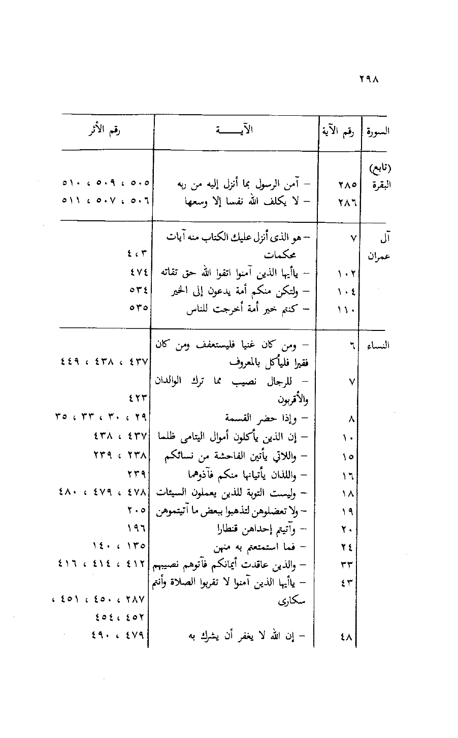 السورة/ رقم الآية/ الآية/ رقم الأثر (تابع) البقرة/ 285/- آمن الرسول بما أنزل إليه من ربه/ 505، 509، 510 286/- لا يكلف الله نفسا إلا وسعها/ 506، 507، 511 آل/ 7/- هو الذى أنزل عليك الكتاب منه آيات عمران/ محكمات/ 3، 4 102/- يا أيها الذين آمنوا اتقوا الله حق تقاته/ 474 104/- ولتكن منكم أمة يدعون إلى الخير/ 534 110/- كنتم خير أمة أخرجت للناس/ 535 النساء/ 6/- ومن كان غنيا فليستعفف ومن كان فقيرا فليأكل بالمعروف/ 437، 438، 449 7/- للرجال نصيب مما ترك الوالدان والأقربون/ 423 8/- وإذا حضر القسمة/ 29، 30، 33، 35 10/- إن الذين يأكلون أموال اليتامى ظلما/ 437، 438 15/- واللاتي يأتين الفاحشة من نسائكم/ 238، 239 16/- واللذان يأتيانها منكم فآذوهما/ 239 18/- وليست التوبة للذين يعملون السيئات/ 478، 479، 480 19/- ولا تعضلوهن لتذهبوا ببعض ما آتيتموهن/ 205 20/- وآتيتم إحداهن قنطارا/ 196 24/- فما استمتعتم به منهن/ 135، 140 33/- والذين عاقدت أيمانكم فآتوهم نصيبهم/ 412، 414، 416 43/- يا أيها الذين آمنوا لا تقربوا الصلاة وأنتم سكارى/ 287، 450، 451، 452، 454 48/- إن الله لا يغفر أن يشرك به/ 479، 490