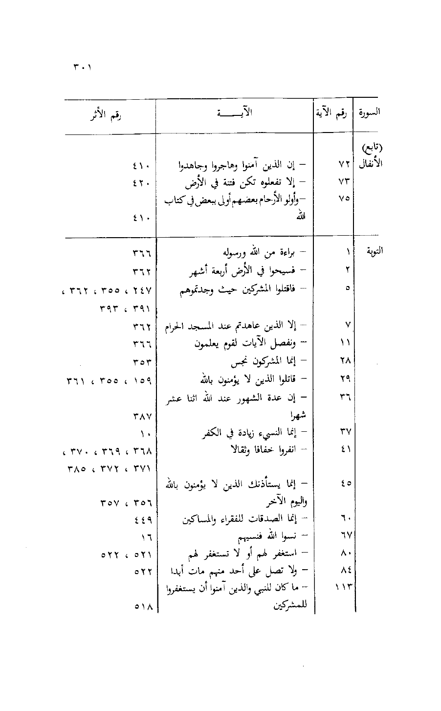 السورة/ رقم الآية/ الآية/ رقم الأثر (تابع) الأنفال/ 72/- إن الذين آمنوا وهاجروا وجاهدوا/ 410 73/- إلا تفعلوه تكن فتنة في الأرض/ 420 75/- وأولو الأرحام بعضهم أولى ببعض في كتاب الله/ 410 التوبة/ 1/- براءة من الله ورسوله/ 366 2/- فسيحوا في الأرض أربعة أشهر/ 362 5/- فاقتلوا المشركين حيث وجدتموهم/ 247، 355، 362، 391، 393 7/- إلا الذين عاهدتم عند المسجد الحرام/ 362 11/- ونفصل الآيات لقوم يعلمون/ 366 28/- إنما المشركون نجس/ 353 29/- قاتلوا الذين لا يؤمنون بالله/ 159، 355، 361 36/- إن عدة الشهور عند الله اثنا عشر شهرا/ 387 37/- إنما النسيء زيادة في الكفر/ 10 41/- انفروا خفافا وثقالا/ 368، 369، 370، 371، 372، 385 45/- إنما يستأذنك الذين لا يؤمنون بالله واليوم الآخر/ 356، 357 60/- إنما الصدقات للفقراء والمساكين/ 449 67/- نسوا الله فنسيهم/ 16 80/- استغفر لهم أو لا تستغفر لهم/ 521، 522 84/- ولا تصل على أحد منهم مات أبدا/ 522 113/- ما كان للنبي والذين آمنوا أن يستغفروا للمشركين/ 518