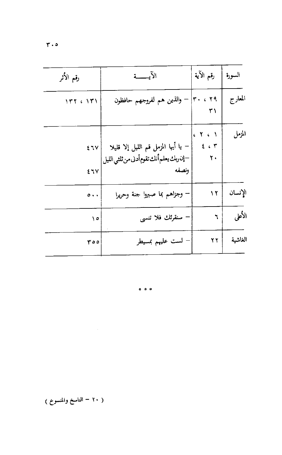 السورة/ رقم الآية/ الآية/ رقم الأثر المعارج/ 29، 30/- والذين هم لفروجهم حافظون/ 131، 132 31 المزمل/ 1، 2، 3، 4،/- يا أيها المزمل قم الليل إلا قليلا/ 467 20/- إن ربك يعلم أنك تقوم أدنى من ثلثي الليل ونصفه/ 467 الإنسان/ 12/- وجزاهم بما صبروا جنة وحريرا/ 500 الأعلى/ 6/- سنقرئك فلا تنسى/ 15 الغاشية/ 22/- لست عليهم بمسيطر/ 355