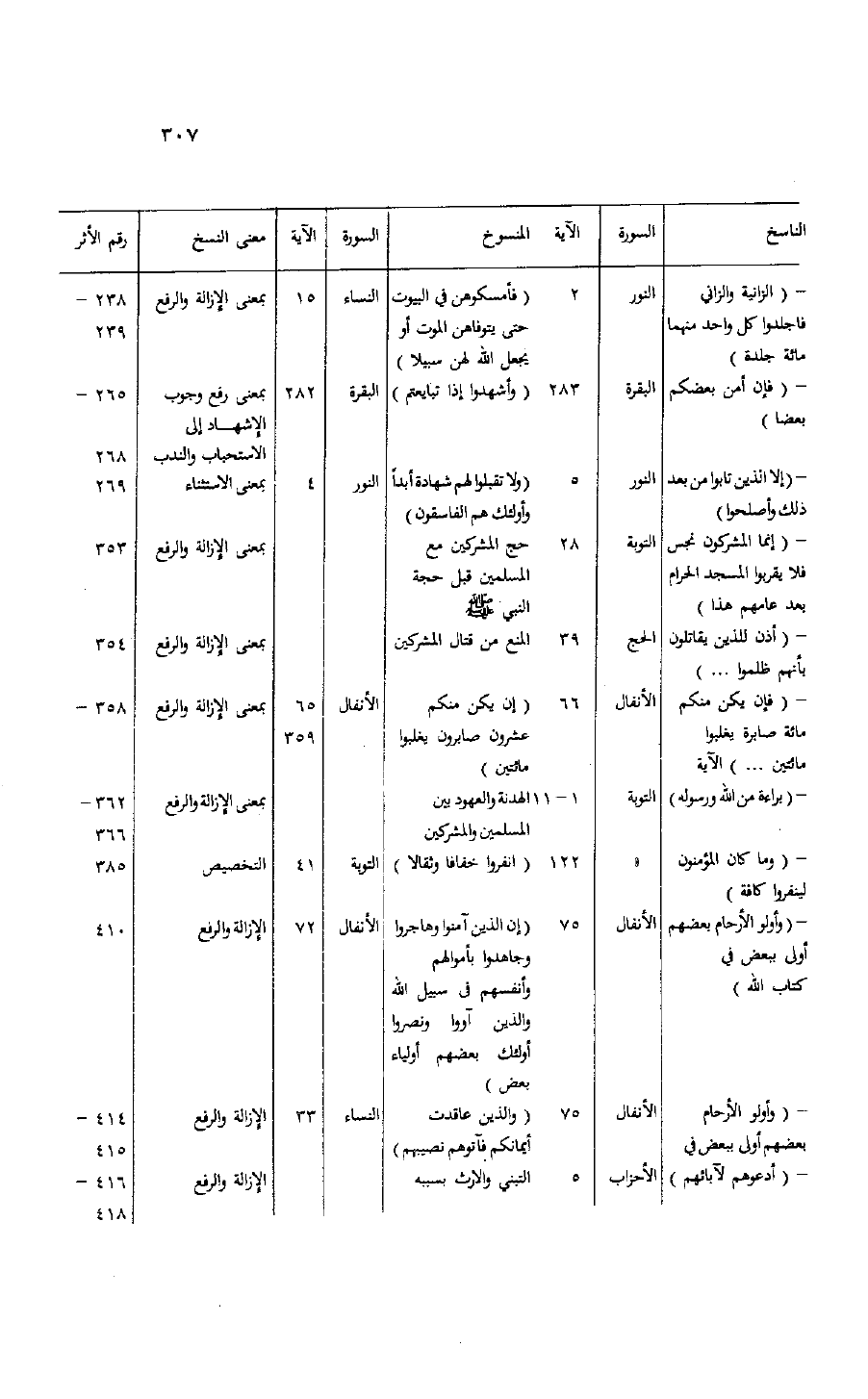 الناسخ/ السورة/ الآية المنسوخ/ السورة/ الآية/ معنى النسخ/ رقم الأثر- (الزانية والزاني/ النور/ 2 (فأمسكوهن في البيوت/ النساء/ 15/ بمعنى الإزالة والرفع/ 238 - فاجلدوا كل واحد منهما// حتى يتوفاهن الموت أو//// 239 مائة جلدة) // يجعل الله لهن سبيلا) ////- (فإن أمن بعضكم/ البقرة/ 283 (وأشهدوا إذا تبايعتم) / البقرة/ 282/ بمعنى رفع وجوب/ 265 - بعضا) ///// الإشهاد إلى الاستحباب والندب/ 268 - (إلا الذين تابوا من بعد/ النور/ 5 (ولا تقبلوا لهم شهادة أبدا/ النور/ 4/ بمعنى الاستثناء/ 269 ذلك وأصلحوا) // وأولئك هم الفاسقون) ////- (إنما المشركون نجس/ التوبة/ 28 حج المشركين مع/// بمعنى الإزالة والرفع/ 353 فلا يقربوا المسجد الحرام// المسلمين قبل حجة//// بعد عامهم هذا) // النبي صلّى الله عليه وسلم////- (أذن للذين يقاتلون/ الحج/ 39 المنع من قتال المشركين/// بمعنى الإزالة والرفع/ 354 بأنهم ظلموا ... ) /