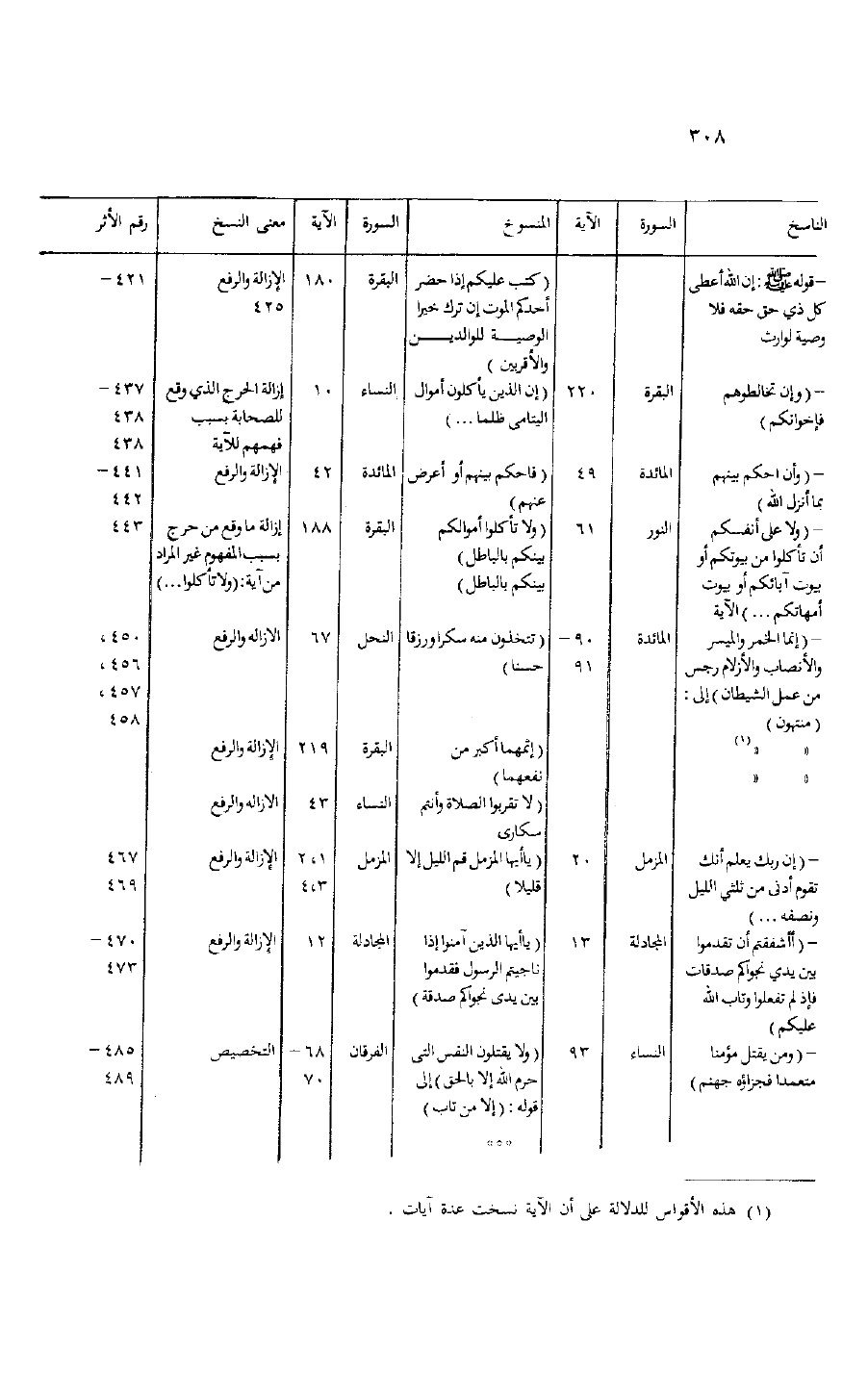 الناسخ/ السورة/ الآية/ المنسوخ/ السورة/ الآية/ معنى النسخ/ رقم الأثر- قوله صلّى الله عليه وسلم: إن الله أعطى/// (كتب عليكم إذا حضر/ البقرة/ 180/ الإزالة والرفع/ 421 - كل ذي حق حقه فلا/// أحدكم الموت إن ترك خيرا/// 425/ وصية لوارث/// الوصية للوالدين//// والأقربين) /- (وإن تخالطوهم/ البقرة/ 220/ (إن الذين يأكلون أموال/ النساء/ 10/ إزالة الحرج الذي وقع/ 437 - فإخوانكم) /// اليتامى ظلما ... ) /// للصحابة بسبب/ 438////// فهمهم للآية/ 438 - (وأن احكم بينهم/ المائدة/ 49/ (فاحكم بينهم أو أعرض/ المائدة/ 42/ الإزالة والرفع/ 441 - بما أنزل الله) /// عنهم) //// 442 - (ولا على أنفسكم/ النور/ 61/ (ولا تأكلوا أموالكم/ البقرة/ 188/ الإزالة ما وقع من حرج/ 443 أن تأكلوا من بيوتكم أو/// بينكم بالباطل) /// بسبب المفهوم غير المراد/ بيوت آبائكم أو بيوت/// بينكم بالباطل) /// من آية: (ولا تأكلوا ... ) /