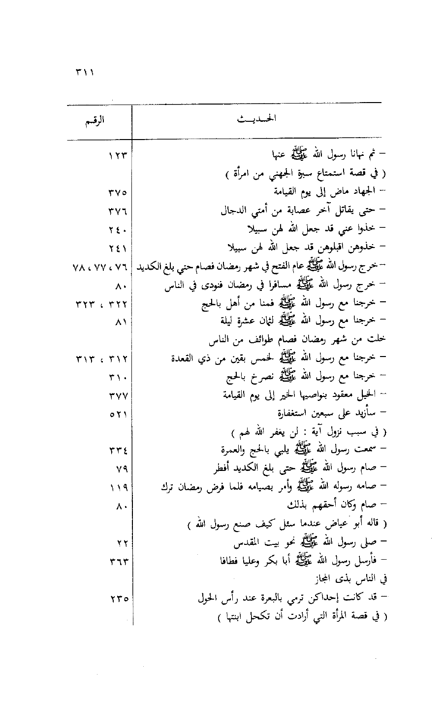 الحديث الرقم- ثم نهانا رسول الله صلّى الله عليه وسلم عنها 123 (في قصة استمتاع سبرة الجهني من امرأة) - الجهاد ماض إلى يوم القيامة 375 - حتى يقاتل آخر عصابة من أمتي الدجال 376 - خذوا عني قد جعل الله لهن سبيلا 240 - خذوهن اقبلوهن قد جعل الله لهن سبيلا 241 - خرج رسول الله صلّى الله عليه وسلم عام الفتح في شهر رمضان فصام حتى بلغ الكديد 76، 77، 78 - خرج رسول الله صلّى الله عليه وسلم مسافرا في رمضان فنودى في الناس 80 - خرجنا مع رسول الله صلّى الله عليه وسلم فمنا من أهل بالحج 322، 323 - خرجنا مع رسول الله صلّى الله عليه وسلم لثمان عشرة ليلة 81 خلت من شهر رمضان فصام طوائف من الناس- خرجنا مع رسول الله صلّى الله عليه وسلم لخمس بقين من ذي القعدة 312، 313 - خرجنا مع رسول الله صلّى الله عليه وسلم نصرخ بالحج 310 - الخيل معقود بنواصيها الخير إلى يوم القيامة 377 - سأزيد على سبعين استغفارة 521 (في سبب نزول آية: لن يغفر الله لهم) - سمعت رسول الله صلّى الله عليه وسلم يلبي بالحج والعمرة 334 - صام رسول الله صلّى الله عليه وسلم حتى بلغ الكديد أفطر 79 - صامه رسوله الله صلّى الله عليه وسلم وأمر بصيامه فلما فرض رمضان ترك 119 - صام وكان أحقهم بذلك 80 (قاله أبو عياض عند ما سئل كيف صنع رسول الله) - صلّى رسول الله صلّى الله عليه وسلم نحو بيت المقدس 22 - فأرسل رسول الله صلّى الله عليه وسلم أبا بكر وعليا فطافا 363 في الناس بذى المجاز- قد كانت إحداكن ترمي بالبعرة عند رأس الحول 235 (في قصة المرأة التي أرادت أن تكحل ابنتها)