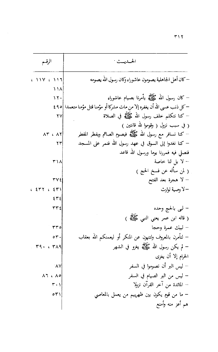 الحديث الرقم- كان أهل الجاهلية يصومون عاشوراء وكان رسول الله يصومه 116، 117، 118 - كان رسول الله صلّى الله عليه وسلم يأمرنا بصيام عاشوراء 120 - كل ذنب عسى الله أن يغفره إلا من مات مشركا أو مؤمنا قتل مؤمنا متعمدا 495 - كنا نتكلم خلف رسول الله صلّى الله عليه وسلم في الصلاة 27 (في سبب نزول (وقوموا لله قانتين) - كنا نسافر مع رسول الله صلّى الله عليه وسلم فيصوم الصائم ويفطر المفطر 82، 83 - كنا نغدوا إلى السوق في عهد رسول الله فنمر على المسجد 23 فنصلي فيه فمررنا يوما ورسول الله قاعد- لا بل لنا خاصة 318 (لمن سأله عن فسخ الحج) - لا هجرة بعد الفتح 374 - لا وصية لوارث 431، 432، 434 - لبى بالحج وحده 334 (قاله ابن عمر يعني النبي صلّى الله عليه وسلم) - لبيك عمرة وحجا 335 - لتأمرن بالمعروف ولتنهون عن المنكر أو ليعمنكم الله بعقاب 530 - لم يكن رسول الله صلّى الله عليه وسلم يغزو في الشهر 389، 390 الحرام إلا أن يغزى- ليس البر أن تصوموا في السفر 87 - ليس من البر الصيام في السفر 85، 86 - المائدة من آخر القرآن نزولا 301 - ما من قوم يكون بين ظهريهم من يعمل بالمعاصي 531 هم أعز منه وأمنع
