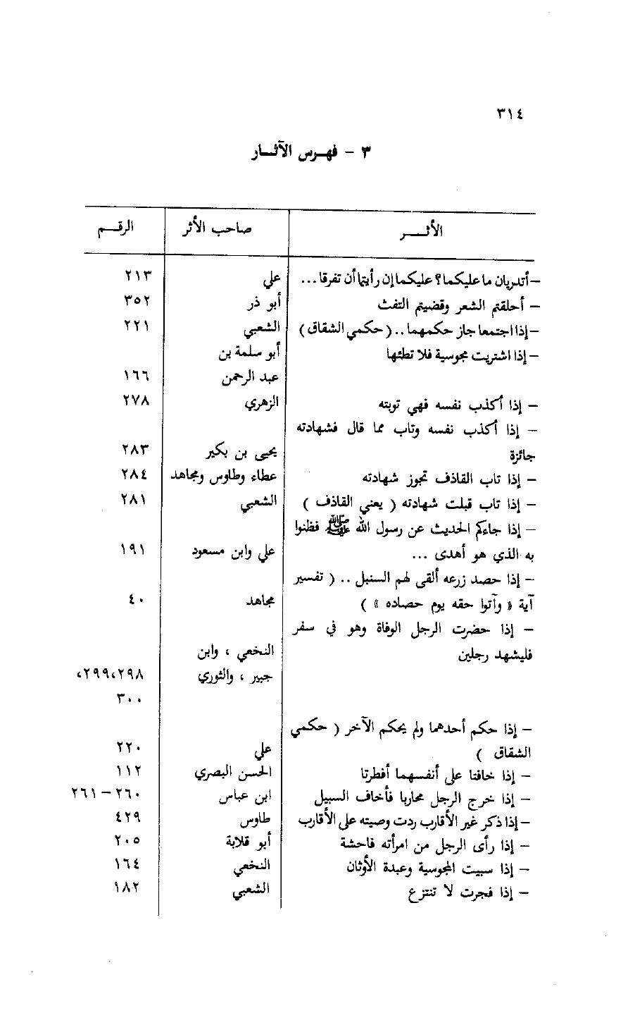 الأثر/ صاحب الأثر/ الرقم- أتدريان ما عليكما؟ عليكما إن رأيتما أن تفرقا ... / علي/ 213 - أحلقتم الشعر وقضيتم التفث/ أبو ذر/ 352 - إذا اجتمعا جاز حكمهما .. (حكمي الشقاق) / الشعبي/ 221 - إذا اشتريت مجوسية فلا تطئها/ أبو سلمة بن// عبد الرحمن/ 166 - إذا أكذب نفسه فهي توبته/ الزهري/ 278 - إذا أكذب نفسه وتاب مما قال فشهادته// جائزة/ يحيى بن بكير/ 283 - إذا تاب القاذف تجوز شهادته/ عطاء وطاوس ومجاهد/ 284 - إذا تاب قبلت شهادته (يعني القاذف) / الشعبي/ 281 - إذا جاءكم الحديث عن رسول الله صلّى الله عليه وسلم فظنوا// به الذي هو أهدى ... / علي وابن مسعود/ 191 - إذا حصد زرعه ألقى لهم السنبل .. (تفسير// آية «وآتوا حقه يوم حصاده») / مجاهد/ 40 - إذا حضرت الرجل الوفاة وهو في سفر// فليشهد رجلين/ النخعي، وابن// جبير، والثوري/ 298، 299،// 300 - إذا حكم أحدهما ولم يحكم الآخر (حكمي// الشقاق) / علي/ 220 - إذا خافتا على أنفسهما أفطرتا/ الحسن البصري/ 112 - إذا خرج الرجل محاربا فأخاف السبيل/ ابن عباس/ 260 - 261 - إذا ذكر غير الأقارب ردت وصيته على الأقارب/ طاوس/ 429 - إذا رأى الرجل من امرأته فاحشة/ أبو قلابة/ 205 - إذا سبيت المجوسية وعبدة الأوثان/ النخعي/ 164 - إذا فجرت لا تنتزع/ الشعبي/ 182