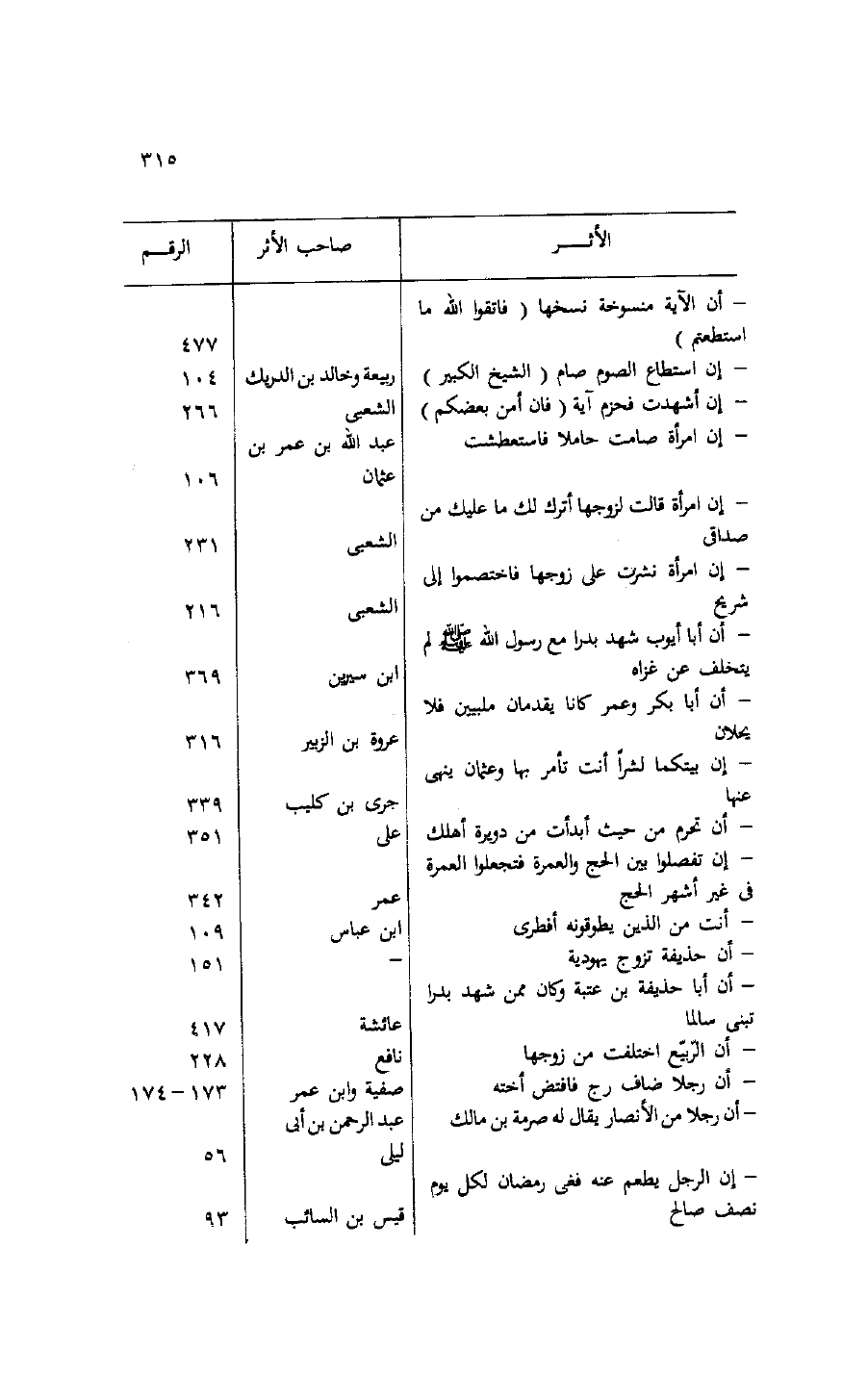 فحزم آية (فان أمن بعضكم) / الشعبى/ 266 - إن امرأة صامت حاملا فاستعطشت/ عبد الله بن عمر بن// عثمان/ 106 - إن امرأة قالت لزوجها أترك لك ما عليك من// صداقى/ الشعبى/ 231 - إن امرأة نشرت على زوجها فاختصموا إلى// شريح/ الشعبى/ 216 - أن أبا أيوب شهد بدرا مع رسول الله صلّى الله عليه وسلم لم// يتخلف عن غزاه/ ابن سيرين/ 369 - أن أبا بكر وعمر كانا يقدمان ملبيين فلا// يحلان/ عروة بن الزبير/ 316 - إن بيتكما لشرا أنت تأمر بها وعثمان ينهى// عنها/ جرى بن كليب/ 339 - أن تحرم من حيث أبدأت من دويرة أهلك/ على/ 351 - إن تفصلوا بين الحج والعمرة فتجعلوا العمرة// فى غير أشهر الحج/ عمر/ 342 - أنت من الذين يطوقونه أفطرى/ ابن عباس/ 109 - أن أبا حذيفة تزوج يهودية/-/ 151 - أن أبا حذيفة بن عتبة وكان ممن شهد بدرا// تبنى سالما/ عائشة/ 417 - أن الرّبيّع اختلفت من زوجها/ نافع/ 228 - أن رجلا ضاف رج فافتض أخته/ صفية وابن عمر/ 173 - 174 - أن رجلا من الأنصار يقال له صرمة بن مالك/ عبد الرحمن بن أبى// ليلى/ 56 - إن الرجل يطعم عنه في رمضان لكل يوم// نصف صاع/ قيس بن السائب/ 93