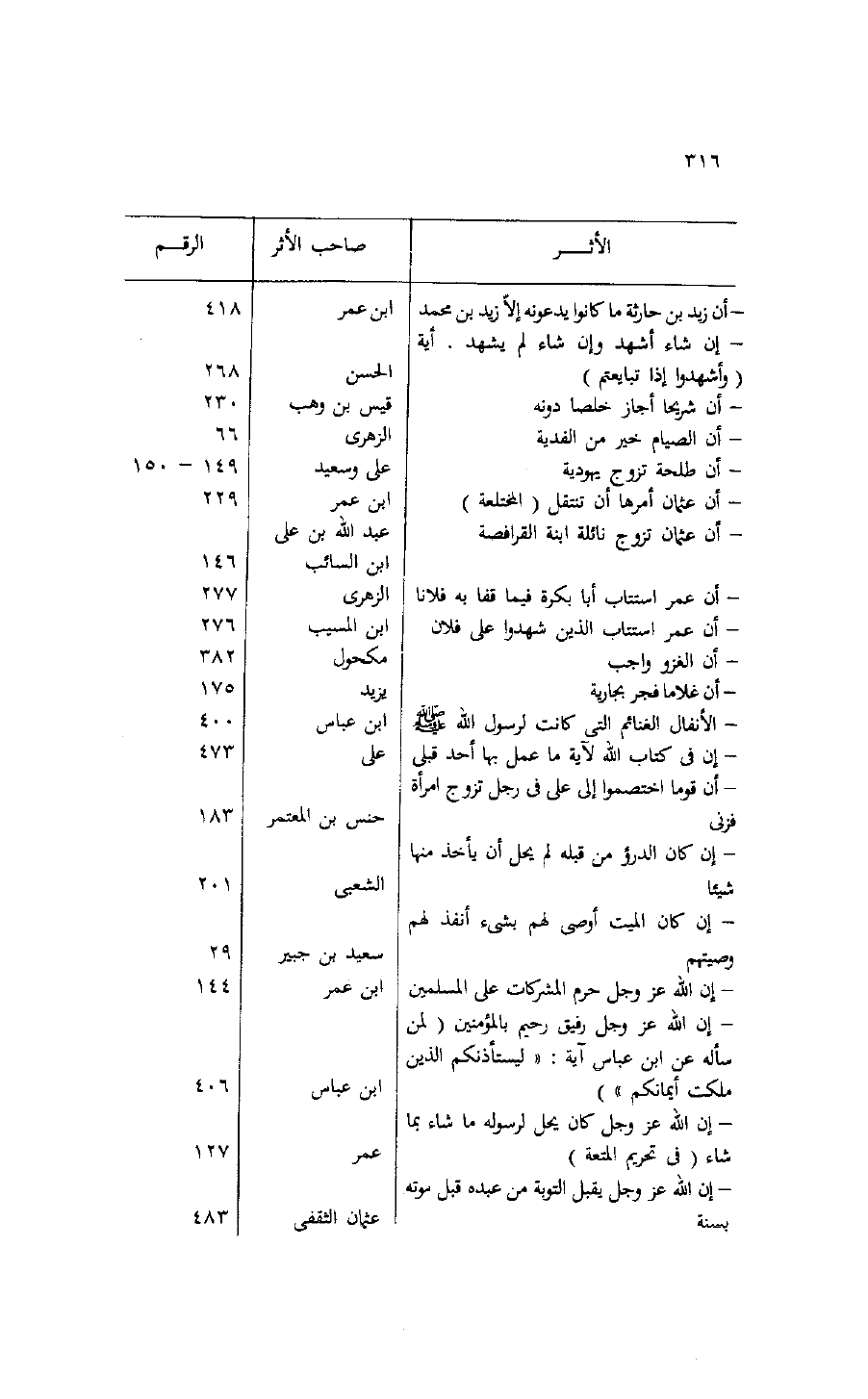 الأثر/ صاحب الأثر/ الرقم- أن زيد بن حارثة ما كانوا يدعونه إلّا زيد بن محمد/ ابن عمر/ 418 - إن شاء أشهد وإن شاء لم يشهد. أية// (وأشهدوا إذا تبايعتم) / الحسن/ 268 - أن شريحا أجاز خلصا دونه/ قيس بن وهب/ 230 - أن الصيام خير من الفدية/ الزهرى/ 66 - أن طلحة تزوج يهودية/ على وسعيد/ 149 - 150 - أن عثمان أمرها أن تنتقل (المختلعة) / ابن عمر/ 229 - أن عثمان تزوج نائلة ابنة القرافصة/ عبد الله بن على// ابن السائب/ 146 - أن عمر استتاب أبا بكرة فيما قفا به فلانا/ الزهرى/ 277 - أن عمر استتاب الذين شهدوا على فلان/ ابن المسيب/ 276 - أن الغزو واجب/ مكحول/ 382 - أن غلاما فجر بجارية/ يزيد/ 175 - الأنفال الغنائم التى كانت لرسول الله صلّى الله عليه وسلم/ ابن عباس/ 400 - إن فى كتاب الله لآية ما عمل بها أحد قبلى/ على/ 473 - أن قوما اختصموا إلى على فى رجل تزوج امرأة// فزنى/ حنس بن المعتمر/ 183 - إن كان الدرء من قبله لم يحل أن يأخذ منها// شيئا/ الشعبى/ 201 - إن كان الميت أوصى لهم بشيء أنفذ لهم// وصيتهم/ سعيد بن جبير/ 29 - إن الله عز وجل حرم المشركات على المسلمين/ ابن عمر/ 144 - إن الله عز وجل رفيق رحيم بالمؤمنين (لمن// سأله عن ابن عباس آية: «ليستأذنكم الذين// ملكت أيمانكم») / ابن عباس/ 406 - إن الله عز وجل كان يحل لرسوله ما شاء بما// شاء (فى تحريم المتعة) / عمر/ 127 - إن الله عز وجل يقبل التوبة من عبده قبل موته// بسنة/ عثمان الثقفى/ 483