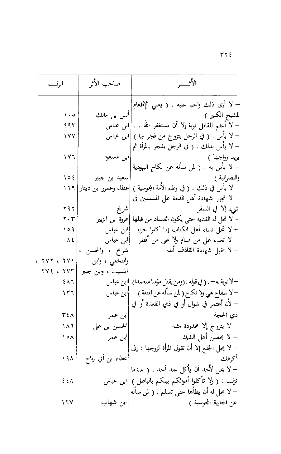 الأثر/ صاحب الأثر/ الرقم- لا أرى ذلك واجبا عليه. (يعني الإطعام/ للشيخ الكبير) / أنس بن مالك/ 105 - لا أعلم للقاتل توبة إلا أن يستغفر الله ... / ابن عباس/ 493 - لا بأس. (في الرجل يتزوج من فجر بها) / ابن عباس/ 177 - لا بأس بذلك. (في الرجل يفجر بالمرأة ثم/ يريد زواجها) / ابن مسعود/ 176 - لا بأس به. (لمن سأله عن نكاح اليهودية/ والنصرانية) / سعيد بن جبير/ 154 - لا بأس في ذلك. (في وطء الأمة المجوسية) / عطاء وعمرو بن دينار/ 169 - لا تجوز شهادة أهل الذمة على المسلمين في/- شيء إلا في السفر/ شريح/ 292 - لا تحل له الفدية حتى يكون الفساد من قبلها/ عروة بن الزبير/ 203 - لا تحل نساء أهل الكتاب إذا كانوا حربا/ ابن عباس/ 159 - لا تعب على من صام ولا على من أفطر/ ابن عباس/ 84 - لا تقبل شهادة القاذف أبدا/ شريح، والحسن،// والنخعي، وابن/ 271، 272،/ المسيب، وابن جبير/ 273، 274 - لا توبة له-. (في قوله: (ومن يقتل مؤمنا متعمدا) / ابن عباس/ 486 - لا سفاح هي ولا نكاح (لمن سأله عن المتعة) / ابن عباس/ 136 - لأن أعتمر في شوال أو في ذي القعدة أو في/ ذي الحجة/ ابن عمر/ 348 - لا يتزوج إلا محدودة مثله/ الحسن بن على/ 186 - لا يحصن أهل الشرك/ ابن عمر/ 158 - لا يحل الخلع إلا أن تقول المرأة لزوجها: إنى/ أكرهك/ عطاء بن أبي رباح/ 198 - لا يحل لأحد أن يأكل عند أحد. (عند ما/ نزلت: (ولا تأكلوا أموالكم بينكم بالباطل) / ابن عباس/ 448 - لا يحل له أن يطأها حتى تسلم. (لمن سأله/ عن الجارية المجوسية) / ابن شهاب/ 167
