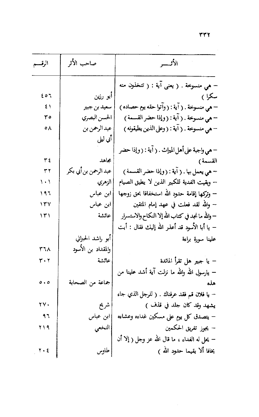 الأثر/ صاحب الأثر/ الرقم- هي منسوخة. (يعنى آية: (تَتَّخِذُونَ مِنْهُ/ سَكَراً) / أبو رزين/ 456 - هي منسوخة. (آية: (وَآتُوا حَقَّهُ يَوْمَ حَصادِهِ) / سعيد بن جبير/ 41 - هي منسوخة. (آية: (وَإِذا حَضَرَ الْقِسْمَةَ) / الحسن البصري/ 35 - هي منسوخة. (آية: (وَعَلَى الَّذِينَ يُطِيقُونَهُ) / عبد الرحمن بن/ 58/ أبي ليلى/- هي واجبة على أهل الميراث. (آية: (وَإِذا حَضَرَ/ الْقِسْمَةَ) / مجاهد/ 34 - هي يعمل بها. (آية: (وَإِذا حَضَرَ الْقِسْمَةَ) / عبد الرحمن بن أبي بكر/ 32 - وبقيت الفدية للكبير الذين لا يطيق الصيام/ الزهري/ 101 - وتركها إقامة حدود الله استخفافا بحق زوجها/ ابن عباس/ 196 - والله لقد فعلت في عهد إمام المتقين/ ابن عباس/ 137 - والله ما نجد في كتاب الله إلا النكاح والاستسرار/ عائشة/ 131 - يا أبا الأسود قد أعذر الله إليك فقال: أبت/ علينا سورة براءة/ أبو راشد الحبراني// والمقداد بن الأسود/ 368 - يا جبير هل تقرأ المائدة/ عائشة/ 32 - يا رسول الله والله ما نزلت آية أشد علينا من/ هذه/ جماعة من الصحابة/ 505 - يا فلان قم فقد عرفناك. (للرجل الذي جاء/ يشهد وقد كان جلد في قذف) / شريح/ 270 - يتصدق كل يوم على مسكين غداءه وعشاءه/ ابن عباس/ 96 - يجوز تفريق الحكمين/ النخعي/ 219 - يحل له الفداء، ما قال الله عز وجل (إلا أن يخافا ألا يقيما حدود الله) / طاوس/ 204