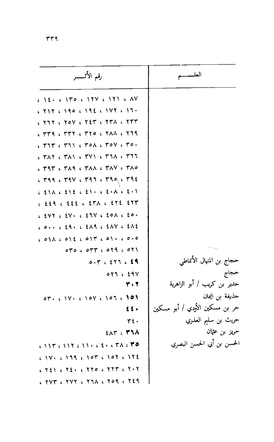 العلم/ رقم الأثر 87، 121، 127، 135، 140، 160، 172، 194، 195، 212، 233، 238، 243، 257، 262، 269، 288، 325، 332، 339، 350، 357، 358، 361، 363، 366، 368، 371، 381، 382، 385، 387، 388، 389، 393، 394، 395، 396، 397، 399، 401، 408، 410، 414، 418، 423، 424، 438، 444، 449، 450، 458، 467، 470، 472، 484، 487، 489، 490، 500، 505، 510، 513، 514، 518، 521، 529، 533، 535 حجاج بن المنهال الأنماطي 49، 426، 503 حجاج 497، 526 حدير بن كريب/ أبو الزاهرية 302 حذيفة بن اليمان 151، 156، 157، 170، 530 حر بن مسكين الأودي/ أبو مسكين 440 حريث بن سليم العذري 340 حريز بن عثمان 368، 483 الحسن بن أبي الحسن البصري 35، 38، 40، 110، 112، 113، 124، 152، 153، 169، 170، 202، 223، 225، 240، 241، 249، 259، 268، 272، 273،