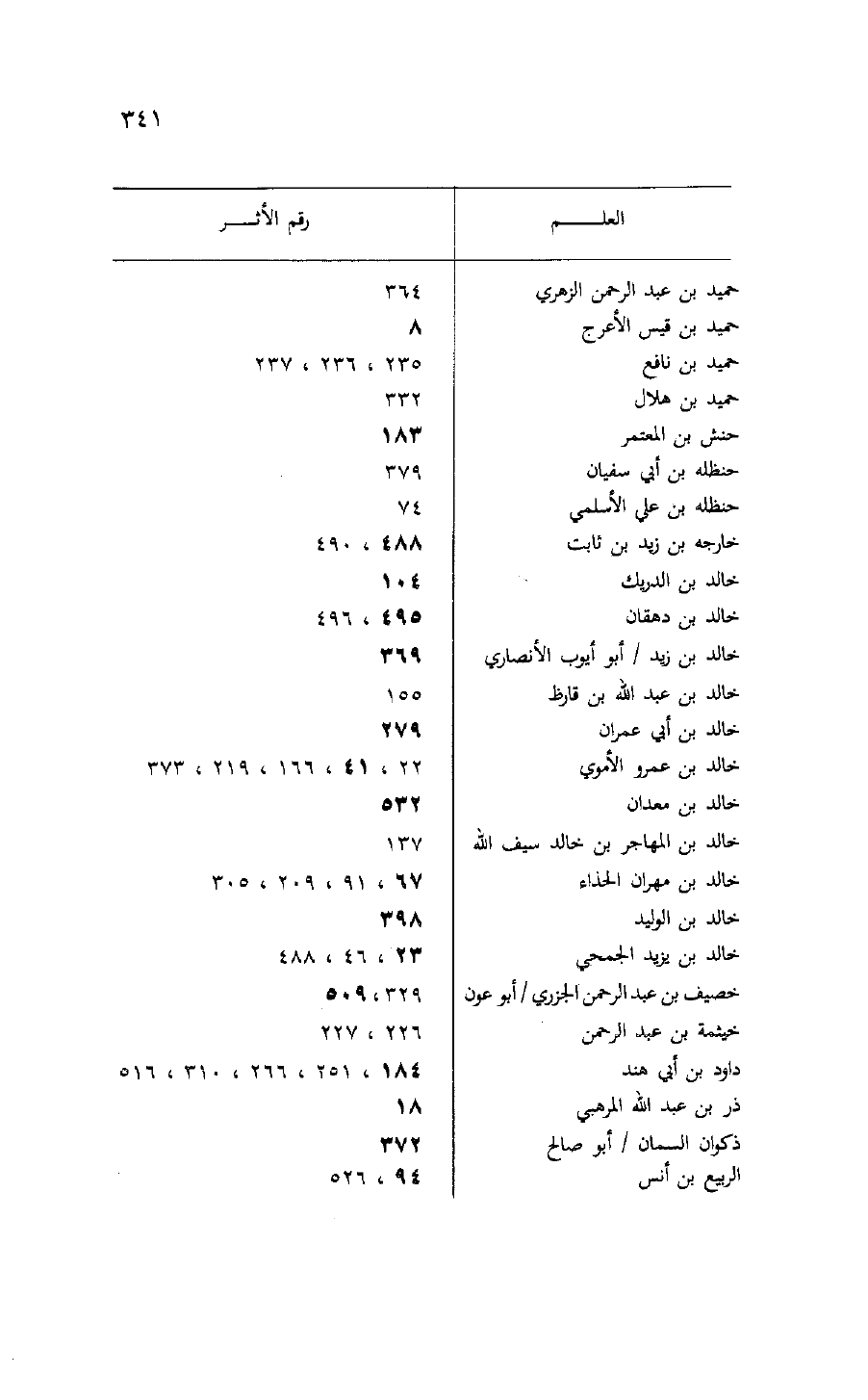 العلم/ رقم الأثر حميد بن عبد الرحمن الزهري 364 حميد بن قيس الأعرج 8 حميد بن نافع 235، 236، 237 حميد بن هلال 332 حنش بن المعتمر 183 حنظلة بن أبي سفيان 379 حنظلة بن علي الأسلمي 74 خارجة بن زيد بن ثابت 488، 490 خالد بن الدريك 104 خالد بن دهقان 495، 496 خالد بن زيد/ أبو أيوب الأنصاري 369 خالد بن عبد الله بن قارظ 155 خالد بن أبي عمران 279 خالد بن عمرو الأموي 22، 41، 166، 219، 373 خالد بن معدان 532 خالد بن المهاجر بن خالد سيف الله 137 خالد بن مهران الحذاء 67، 91، 209، 305 خالد بن الوليد 398 خالد بن يزيد الجمحي 23، 46، 488 خصيف بن عبد الرحمن الجزري/ أبو عون 329، 509 خيثمة بن عبد الرحمن 226، 227 داود بن أبي هند 184، 251، 266، 310، 516 ذر بن عبد الله المرهبي 18 ذكوان السمان/ أبو صالح 372 الربيع بن أنس 94، 526