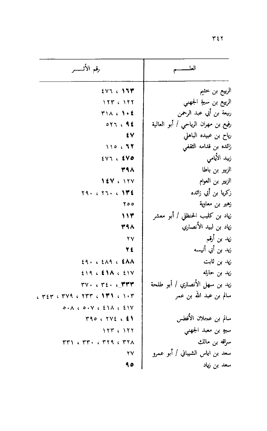 العلم/ رقم الأثر الربيع بن خثيم 163، 476 الربيع بن سبرة الجهني 122، 123 ربيعة بن أبي عبد الرحمن 104، 318 رفيع بن مهران الرياحي/ أبو العالية 94، 526 رياح بن عبيده الباهلي 47 زائده بن قدامة الثقفي 62، 115 زبيد الأيامي 475، 476 الزبير بن باطا 398 الزبير بن العوام 127، 147 زكريا بن أبي زائده 134، 260، 290 زهير بن معاوية 255 زياد بن كليب الحنظلي/ أبو معشر 113 زياد بن لبيد الأنصاري 398 زيد بن أرقم 27 زيد بن أبي أنيسه 24 زيد بن ثابت 488، 489، 490 زيد بن حارثة 417، 418، 419 زيد بن سهل الأنصاري/ أبو طلحة 333، 340، 370 سالم بن عبد الله بن عمر 103، 131، 233، 379، 343، 417، 418، 507، 508 سالم بن عجلان الأفطس 41، 274، 395 سبرة بن معبد الجهني 122، 123 سراقه بن مالك 328، 329، 330، 331 سعد بن اياس الشيباني/ أبو عمرو 27 سعد بن زياد 95