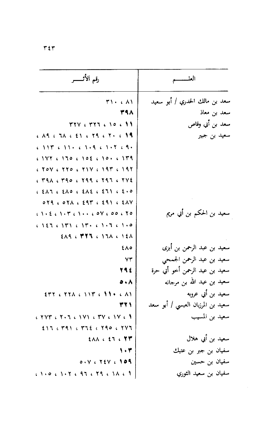 العلم/ رقم الأثر سعد بن مالك الخدري/ أبو سعيد 81، 310 سعد بن معاذ 398 سعد بن أبي وقاص 11، 15، 326، 327 سعيد بن جبير 19، 20، 29، 41، 68، 89، 90، 102، 109، 110، 113، 139، 150، 154، 165، 172، 192، 193، 217، 225، 257، 274، 296، 299، 395، 398، 405، 461، 484، 485، 486، 487، 491، 493، 528، 529 سعيد بن الحكم بن أبي مريم 25، 55، 57، 100، 103، 104، 105، 106، 130، 131، 146، 148، 168، 326، 489 سعيد بن عبد الرحمن بن أبزى 485 سعيد بن عبد الرحمن الجمحي 73 سعيد بن عبد الرحمن أخو أبي حرة 294 سعيد بن عبد الله بن مرجانه 508 سعيد بن أبي عروبة 81، 110، 113، 228، 432 سعيد بن المرزبان العبسي/ أبو سعد 321 سعيد بن المسيب 1، 17، 37، 171، 206، 273، 276، 295، 364، 391، 416 سعيد بن أبي هلال 23، 46، 488 سفيان بن جبر بن عتيك 103 سفيان بن حسين 159، 247، 507 سفيان بن سعيد الثوري 1، 18، 29، 96، 102، 105،