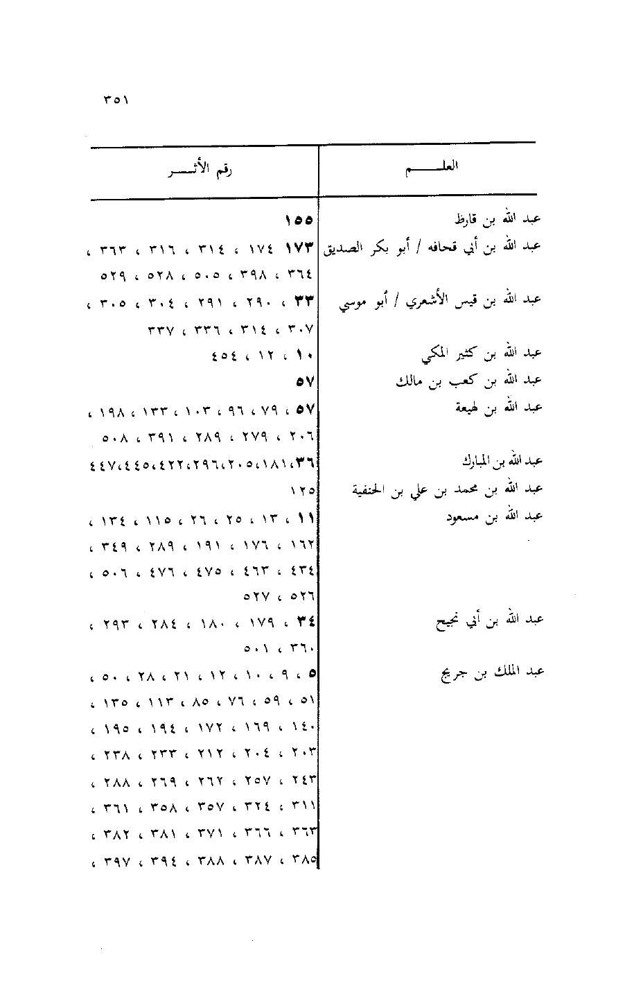 العلم/ رقم الأثر عبد الله بن قارظ 155 عبد الله بن أبي قحافة/ أبو بكر الصديق 173، 174، 314، 316، 363، 364، 398، 505، 528، 529 عبد الله بن قيس الأشعري/ أبو موسى 33، 290، 291، 304، 305، 307، 314، 336، 337 عبد الله بن كثير المكي 10، 12، 454 عبد الله بن كعب بن مالك 57 عبد الله بن لهيعة 57، 79، 96، 103، 133، 198، 206، 279، 289، 391، 508 عبد الله بن المبارك 36، 181، 205، 296، 422، 445، 447 عبد الله بن محمد بن علي بن الحنفية 125 عبد الله بن مسعود 11، 13، 25، 26، 115، 134، 162، 176، 191، 289، 349، 434، 463، 475، 476، 506، 526، 527 عبد الله بن أبي نجيح 34، 179، 180، 284، 293، 360، 501 عبد الملك بن جريج 5، 9، 10، 12، 21، 28، 50، 51، 59، 76، 85، 113، 135، 140، 169، 172، 194، 195، 203، 204، 212، 233، 238، 243، 257، 262، 269، 288، 311، 324، 357، 358، 361، 363، 366، 371، 381، 382، 385، 387، 388، 394، 397،