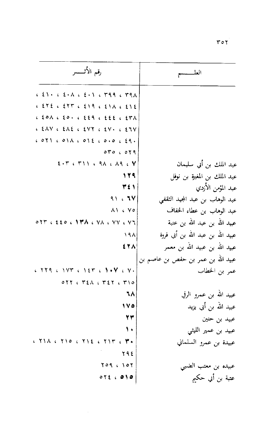 العلم/ رقم الأثر 398، 399، 401، 408، 410، 414، 418، 419، 423، 424، 438، 444، 449، 450، 458، 467، 470، 472، 484، 487، 490، 505، 514، 518، 521، 529، 535 عبد الملك بن أبي سليمان 7، 89، 98، 311، 403 عبد الملك بن المغيرة بن نوفل 129 عبد المؤمن الأزدي 341 عبد الوهاب بن عبد المجيد الثقفي 67، 91 عبد الوهاب بن عطاء الخفاف 75، 81 عبيد الله بن عبد الله بن عتبة 76، 77، 78، 138، 445، 523 عبيد الله بن عبد الله بن أبي فروة 198 عبيد الله بن عبيد الله بن معمر 428 عبيد الله بن عمر بن حفص بن عاصم بن عمر بن الخطاب 70، 107، 143، 173، 229، 315، 342، 348، 522 عبيد الله بن عمرو الرقي 68 عبيد الله بن أبي يزيد 175 عبيد بن حنين 23 عبيد بن عمير الليثي 10 عبيدة بن عمرو السلماني 30، 213، 214، 215، 218، 294 عبيده بن معتب الضبي 152، 259 عتبة بن أبي حكيم 515، 524