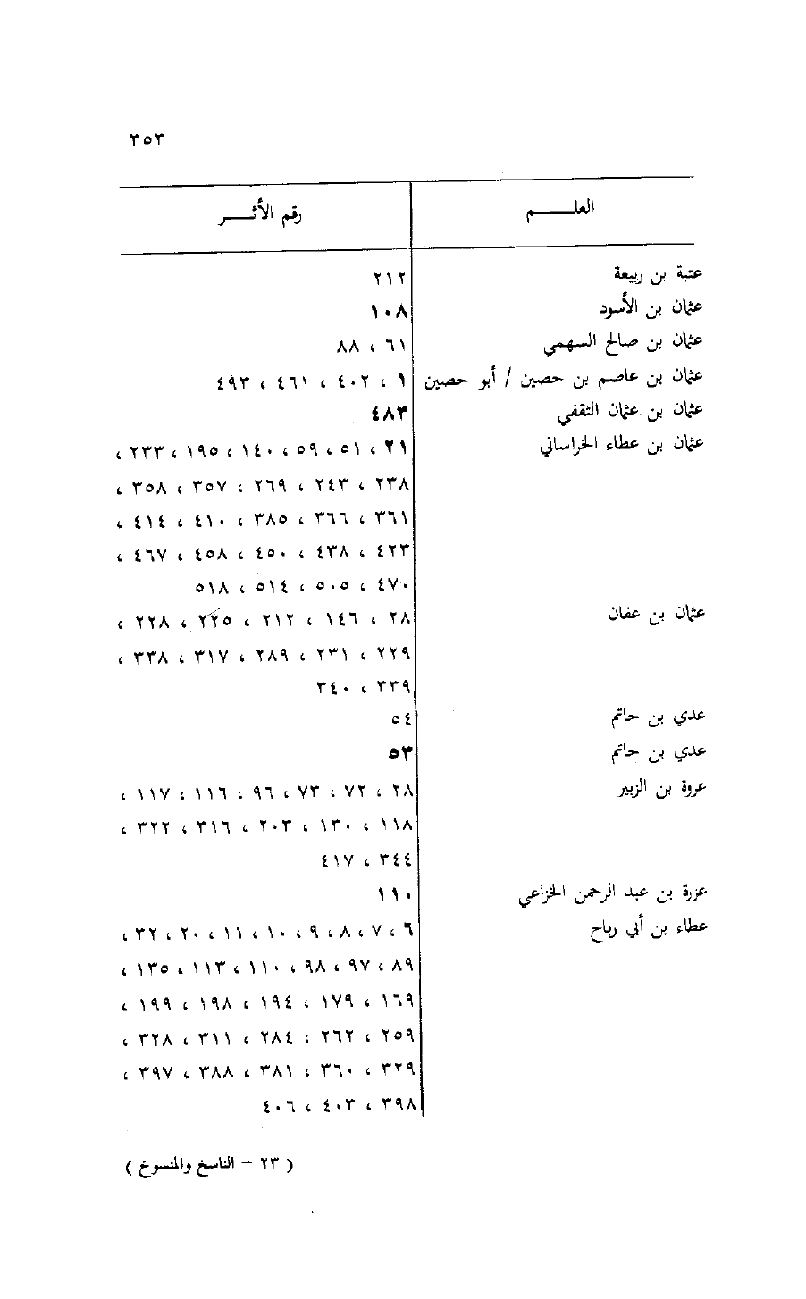 العلم/ رقم الأثر عتبة بن ربيعة 212 عثمان بن الأسود 108 عثمان بن صالح السهمي 61، 88 عثمان بن عاصم بن حصين/ أبو حصين 1، 402، 461، 493 عثمان بن عثمان الثقفي 483 عثمان بن عطاء الخراساني 21، 51، 59، 140، 195، 233، 238، 243، 269، 357، 358، 361، 366، 385، 410، 414، 423، 438، 450، 458، 467، 470، 505، 514، 518 عثمان بن عفان 28، 146، 212، 225، 228، 229، 231، 289، 317، 338، 339، 340 عدي بن حاتم 54 عدي بن حاتم 53 عروة بن الزبير 28، 72، 73، 96، 116، 117، 118، 130، 203، 316، 322، 344، 417 عزرة بن عبد الرحمن الخزاعي 110 عطاء بن أبي رباح 6، 7، 8، 9، 10، 11، 20، 32، 89، 97، 98، 110، 113، 135، 169، 179، 194، 198، 199، 259، 262، 284، 311، 328، 329، 360، 381، 388، 397، 398، 403، 406