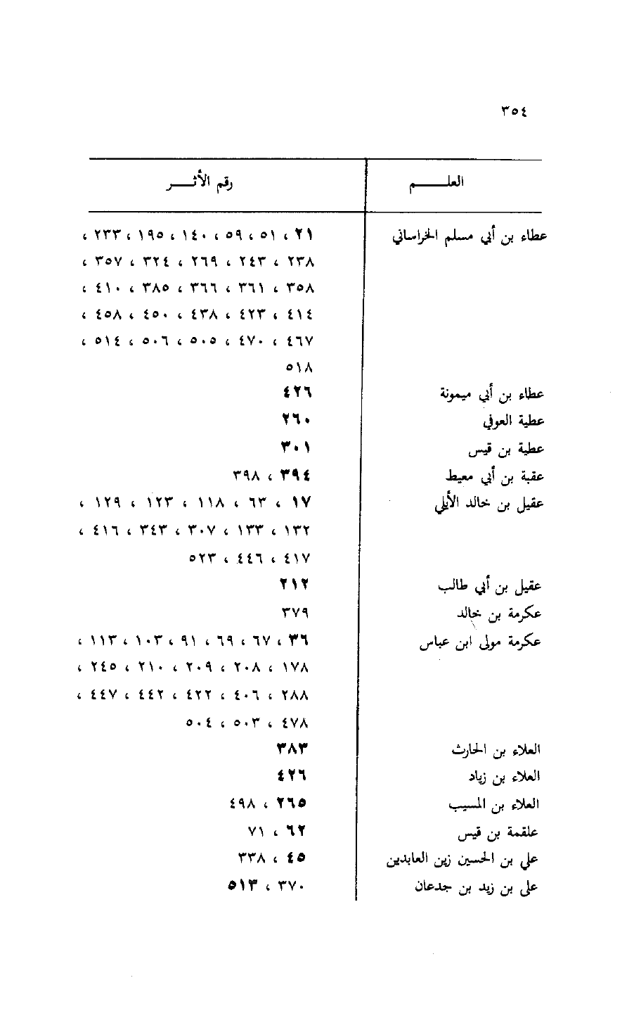 العلم/ رقم الأثر عطاء بن أبي مسلم الخراساني 21، 51، 59، 140، 195، 233، 238، 243، 269، 324، 357، 358، 361، 366، 385، 410، 414، 423، 438، 450، 458، 467، 470، 505، 506، 514، 518 عطاء بن أبي ميمونة 426 عطية العوفي 260 عطية بن قيس 301 عقبة بن أبي معيط 394، 398 عقيل بن خالد الأيلي 17، 63، 118، 123، 129، 132، 133، 307، 343، 416، 417، 446، 523 عقيل بن أبي طالب 212 عكرمة بن خالد 379 عكرمة مولى ابن عباس 36، 67، 69، 91، 103، 113، 178، 208، 209، 210، 245، 288، 406، 422، 442، 447، 478، 503، 504 العلاء بن الحارث 383 العلاء بن زياد 426 العلاء بن المسيب 265، 498 علقمة بن قيس 62، 71 علي بن الحسين زين العابدين 45، 338 على بن زيد بن جدعان 370، 513