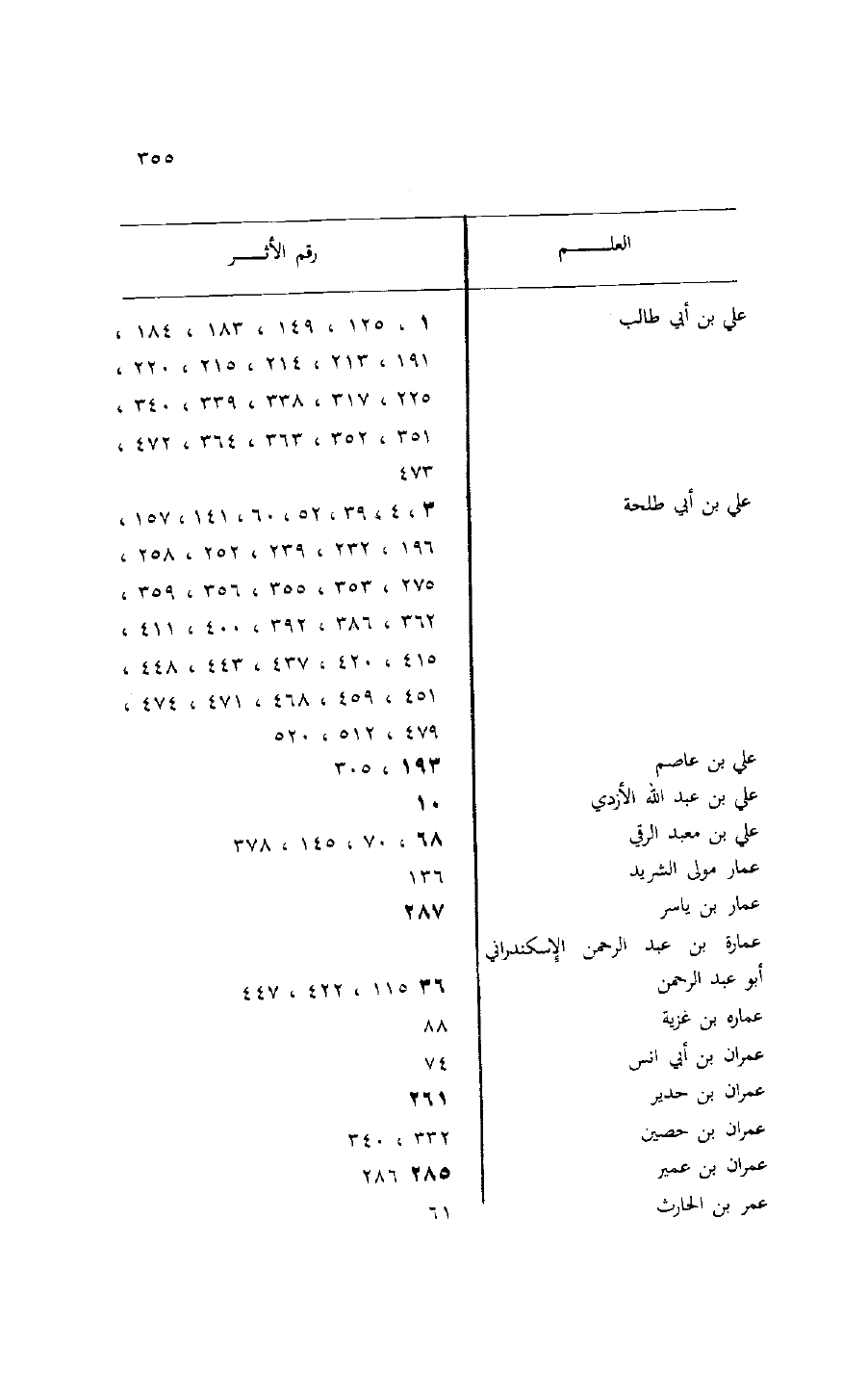 العلم/ رقم الأثر علي بن أبي طالب 1، 125، 149، 183، 184، 191، 213، 214، 215، 220، 225، 317، 338، 339، 340، 351، 352، 363، 364، 472، 473 علي بن أبي طلحة 3، 4، 39، 52، 60، 141، 157، 196، 232، 239، 252، 258، 275، 353، 355، 356، 359، 362، 386، 392، 400، 411، 415، 420، 437، 443، 448، 451، 459، 468، 471، 474، 479، 512، 520 علي بن عاصم 193، 305 علي بن عبد الله الأزدي 10 علي بن معبد الرقي 68، 70، 145، 378 عمار مولى الشريد 136 عمار بن ياسر 287 عمارة بن عبد الرحمن الإسكندراني أبو عبد الرحمن 36، 115، 422، 447 عماره بن غزية 88 عمران بن أبي انس 74 عمران بن حدير 261 عمران بن حصين 332، 340 عمران بن عمير 285 286 عمر بن الحارث 61