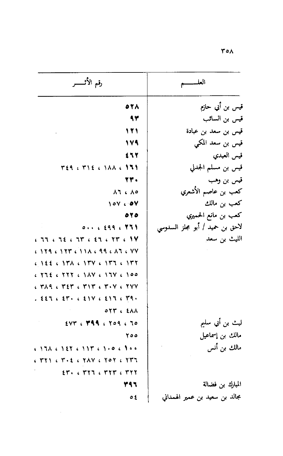 العلم/ رقم الأثر قيس بن أبي حازم 528 قيس بن السائب 93 قيس بن سعد بن عبادة 121 قيس بن سعد المكي 179 قيس العبدي 462 قيس بن مسلم الجدلي 161، 188، 314، 349 قيس بن وهب 230 كعب بن عاصم الأشعري 85، 86 كعب بن مالك 57، 157 كعب بن مانع الحميري 525 لاحق بن حميد/ أبو مجلز السدوسي 261، 499، 500 الليث بن سعد 17، 23، 46، 63، 64، 66، 77، 86، 99، 118، 123، 129، 132، 136، 137، 138، 144، 155، 167، 187، 222، 264، 277، 307، 313، 343، 389، 390، 416، 417، 430، 446.