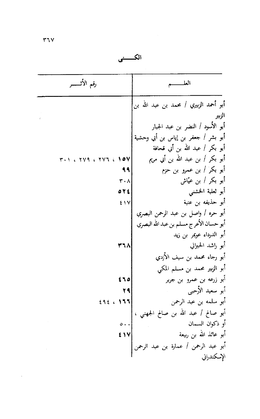 العلم/ رقم الأثر أبو أحمد الزبيري/ محمد بن عبد الله بن الزبير أبو الأسود/ النضر بن عبد الجبار أبو بشر/ جعفر بن إياس بن أبي وحشية أبو بكر/ عبد الله بن أبي قحافة أبو بكر/ بن عبد الله بن أبي مريم 157، 276، 279، 301 أبو بكر/ بن عمرو بن حزم 99 أبو بكر/ بن عيّاش 308 أبو ثعلبة الخشني 524 أبو حذيفة بن عتبة 417 أبو حرة/ واصل بن عبد الرحمن البصري أبو حسان الأعرج مسلم بن عبد الله البصري أبو الدرداء عويمر بن زيد أبو راشد الحبراني 368 أبو رجاء محمد بن سيف الأزدي أبو الزبير محمد بن مسلم المكي أبو زرعه بن عمرو بن جرير 465 أبو سعيد الأرحبى 29 أبو سلمه بن عبد الرحمن 166، 494 أبو صالح/ عبد الله بن صالح الجهني، أو ذكوان السمان 500 أبو عائذ الله بن ربيعة 417 أبو عبد الرحمن/ عمارة بن عبد الرحمن الإسكندراني