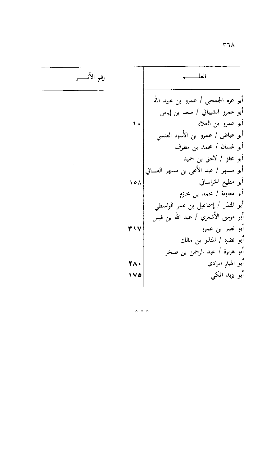 العلم/ رقم الأثر أبو عزة الجمحي/ عمرو بن عبيد الله أبو عمرو الشيباني/ سعد بن إياس أبو عمرو بن العلاء 10 أبو عياض/ عمرو بن الأسود العنسي أبو غسان/ محمد بن مطرف أبو مجلز/ لاحق بن حميد أبو مسهر/ عبد الأعلى بن مسهر الغساني أبو مطيع الخراساني 158 أبو معاوية/ محمد بن خازم أبو المنذر/ إسماعيل بن عمر الواسطي أبو موسى الأشعري/ عبد الله بن قيس أبو نصر بن عمرو 317 أبو نضره/ المنذر بن مالك أبو هريرة/ عبد الرحمن بن صخر أبو الهيثم المرادي 280 أبو يزيد المكي 175