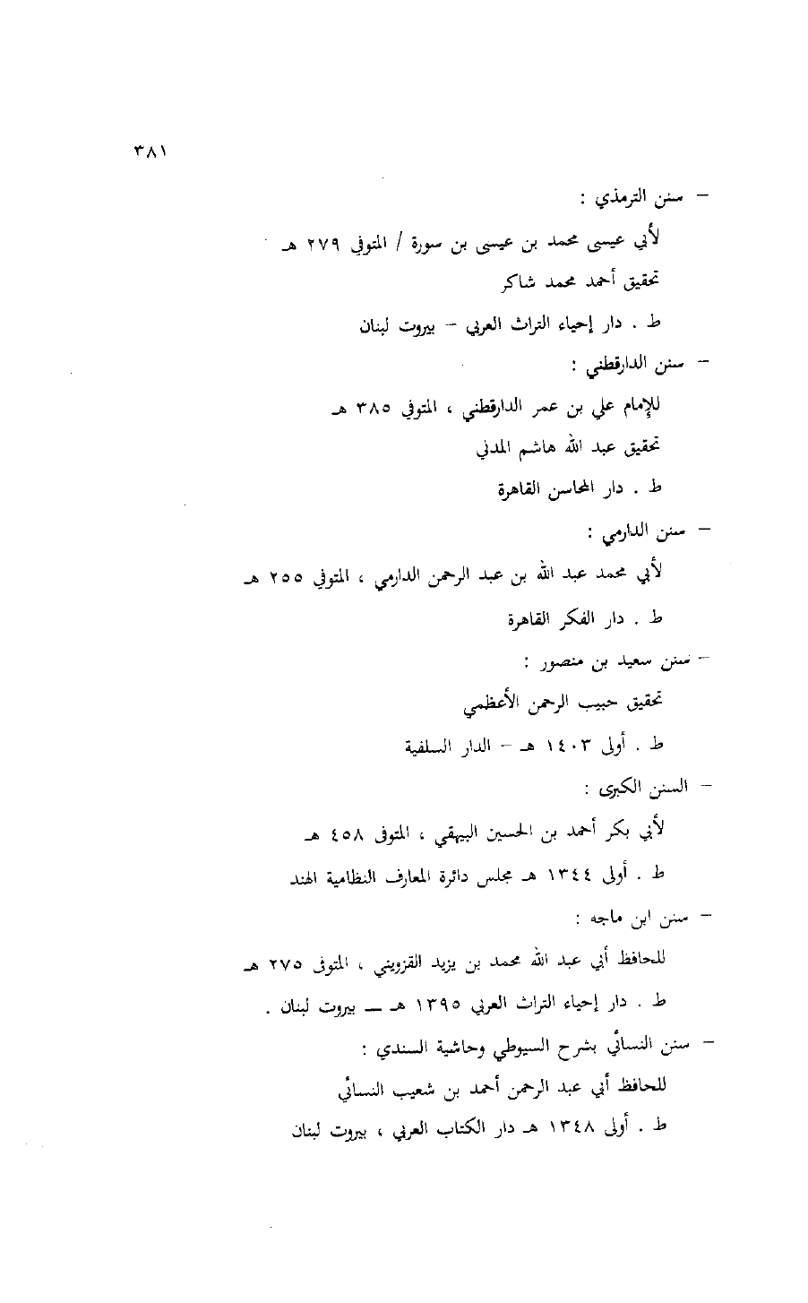 للحافظ أبي عبد الله محمد بن يزيد القزويني، المتوفى 275 هـ ط. دار إحياء التراث العربي 1395 هـ- بيروت لبنان.