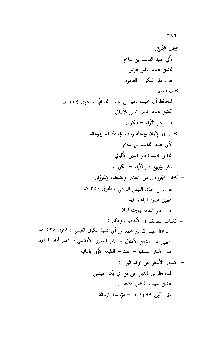 لأبي عبيد القاسم بن سلّام تحقيق محمد ناصر الدين الألباني نشر وتوزيع دار الأرقم- الكويت- كتاب المجروحين من المحدثين والضعفاء والمتروكين: