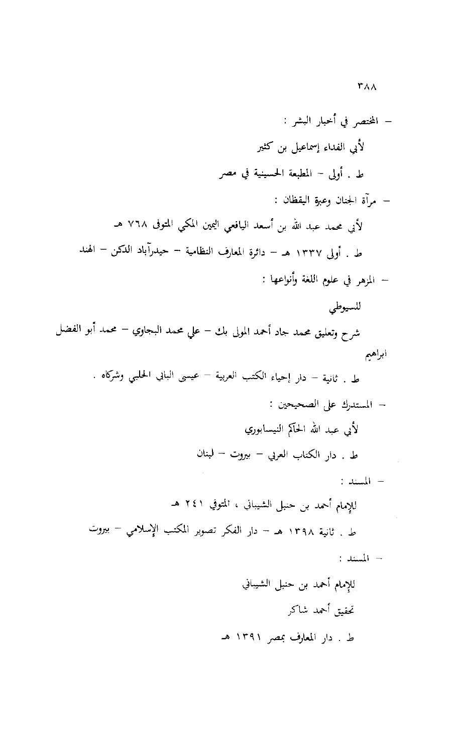 لأبي الفداء إسماعيل بن كثير ط. أولى- المطبعة الحسينية في مصر- مرآة الجنان وعبرة اليقظان: