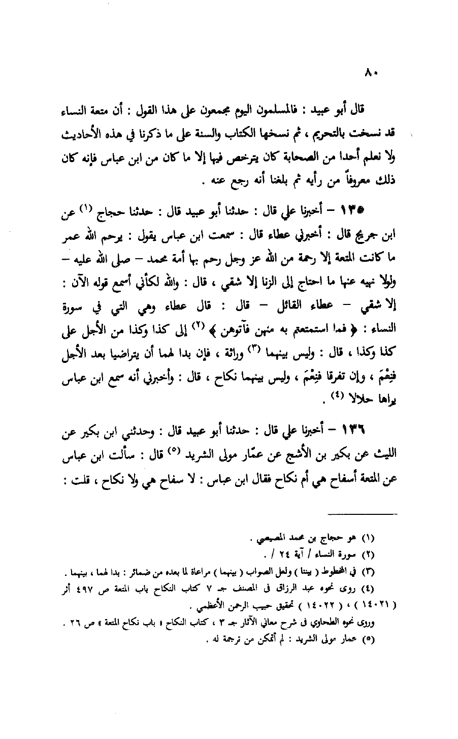 136 - أخبرنا علي قال: حدثنا أبو عبيد قال: وحدثني ابن بكير عن الليث عن بكير بن الأشج عن عمّار مولى الشريد (¬5) قال: سألت ابن عباس عن المتعة أسفاح هي أم نكاح فقال ابن عباس: لا سفاح هي ولا نكاح، قلت: