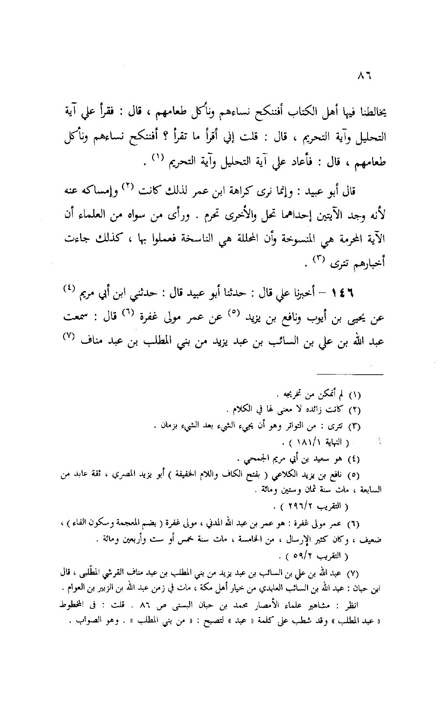 146 - أخبرنا علي قال: حدثنا أبو عبيد قال: حدثني ابن أبي مريم (¬4) عن يحيى بن أيوب ونافع بن يزيد (¬5) عن عمر مولى غفرة (¬6) قال: سمعت عبد الله بن علي بن السائب بن عبد يزيد من بني المطلب بن عبد مناف (¬7)