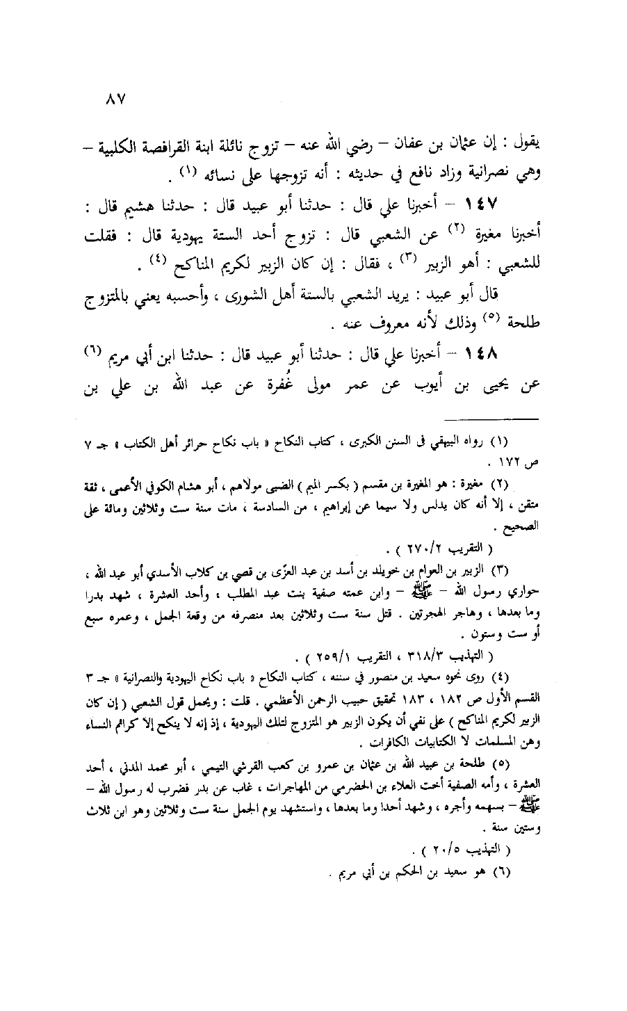 (¬4) روى نحوه سعيد بن منصور في سننه، كتاب النكاح «باب نكاح اليهودية والنصرانية» ج 3 القسم الأول ص 182، 183 تحقيق حبيب الرحمن الأعظمي. قلت: ويحمل قول الشعبي (إن كان الزبير لكريم المناكح) على نفي أن يكون الزبير هو المتزوج لتلك اليهودية، إذ إنه لا ينكح إلا كرائم النساء وهن المسلمات لا الكتابيات الكافرات.