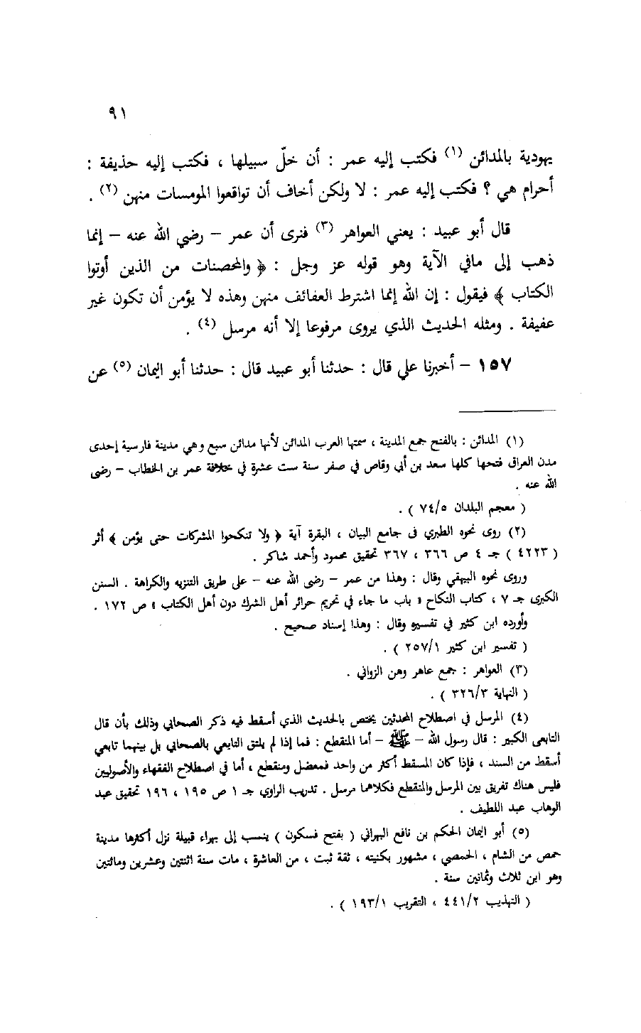 قال أبو عبيد: يعني العواهر (¬3) فنرى أن عمر- رضي الله عنه- إنما ذهب إلى ما في الآية وهو قوله عز وجل: وَالْمُحْصَناتُ مِنَ الَّذِينَ أُوتُوا الْكِتابَ فيقول: إن الله إنما اشترط العفائف منهن وهذه لا يؤمن أن تكون غير عفيفة. ومثله الحديث الذي يروى مرفوعا إلا أنه مرسل (¬4).