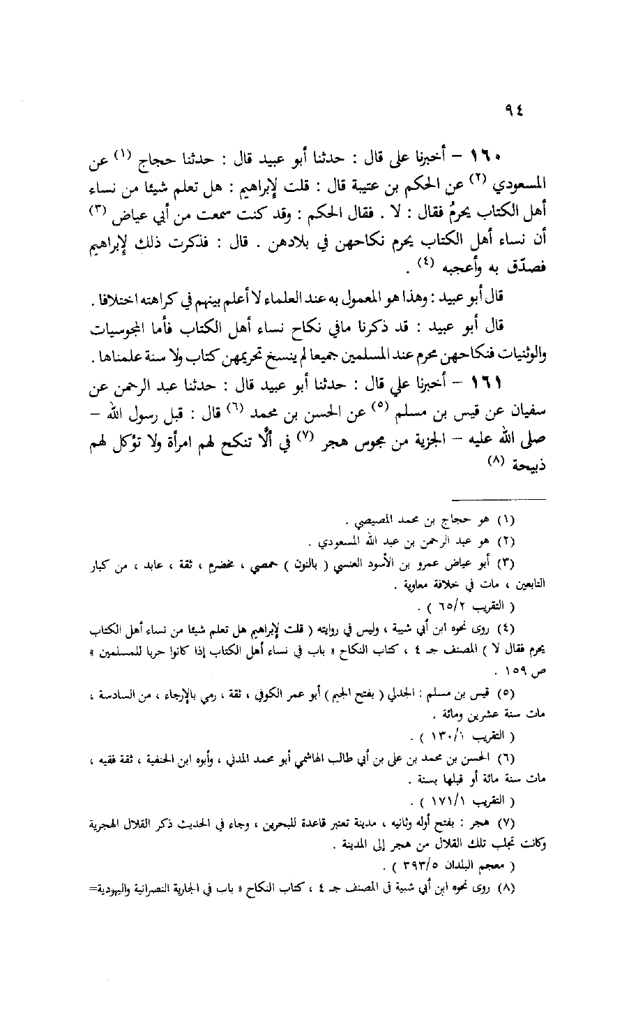 161 - أخبرنا علي قال: حدثنا أبو عبيد قال: حدثنا عبد الرحمن عن سفيان عن قيس بن مسلم (¬5) عن الحسن بن محمد (¬6) قال: قبل رسول الله- صلّى الله عليه- الجزية من مجوس هجر (¬7) في ألّا تنكح لهم امرأة ولا تؤكل لهم ذبيحة (¬8).