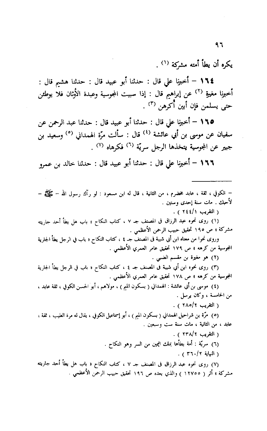 165 - أخبرنا علي قال: حدثنا أبو عبيد قال: حدثنا عبد الرحمن عن سفيان عن موسى بن أبي عائشة (¬4) قال: سألت مرّة الهمداني (¬5) وسعيد بن جبير عن المجوسية يتخذها الرجل سريّة (¬6) فكرهاه (¬7).