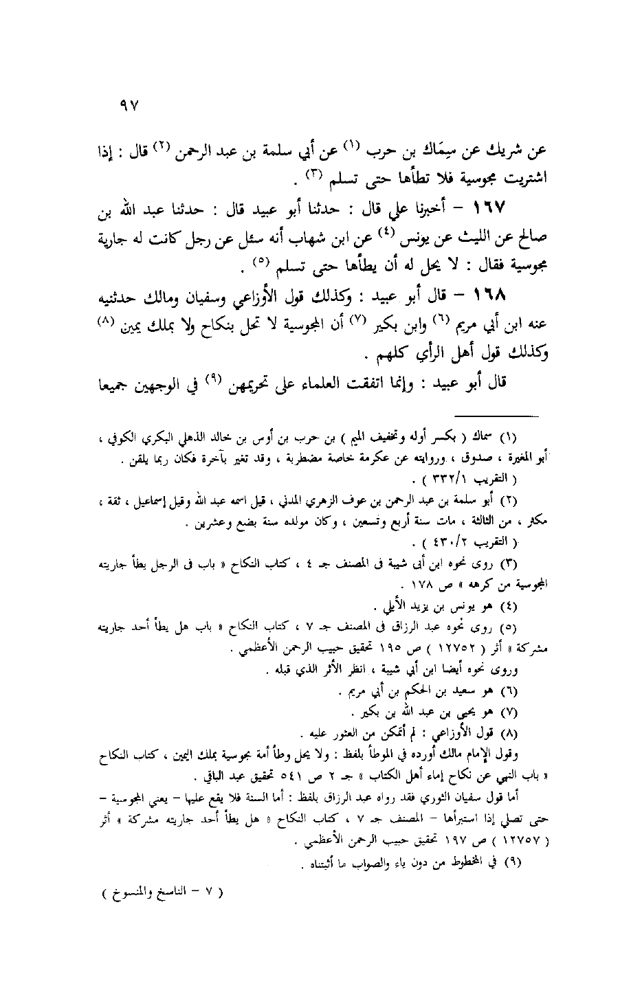 167 - أخبرنا علي قال: حدثنا أبو عبيد قال: حدثنا عبد الله بن صالح عن الليث عن يونس (¬4) عن ابن شهاب أنه سئل عن رجل كانت له جارية مجوسية فقال: لا يحل له أن يطأها حتى تسلم (¬5).