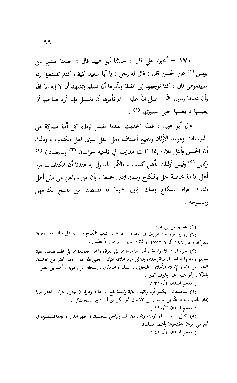 170 - أخبرنا علي قال: حدثنا أبو عبيد قال: حدثنا هشيم عن يونس (¬1) عن الحسن قال: قال له رجل: يا أبا سعيد كيف كنتم تصنعون إذا سبيتموهن قال: كنا نوجهها إلى القبلة ونأمرها أن تسلم وتشهد أن لا إله إلا الله وأن محمدا رسول الله- صلّى الله عليه- ثم نأمرها أن تغتسل فإذا أراد صاحبها أن يصيبها لم يصبها حتى يستبرئها (¬2).
