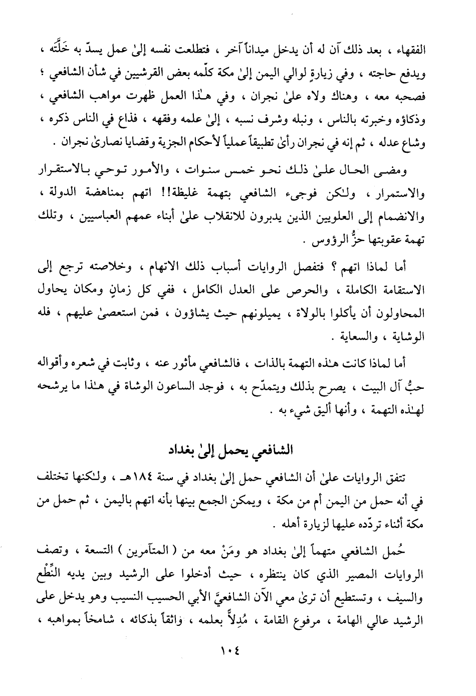 حُمل الشافعي متهماً إلى بغداد هو ومَنْ معه من (المتآمرين) التسعة، وتصف الروايات المصير الذي كان ينتظره، حيث أدخلوا على الرشيد وبين يديه النِّطْع والسيف، وتستطيع أن ترى معي الآن الشافعيَّ الأبي الحسيب النسيب وهو يدخل على الرشيد عالي الهامة، مرفوع القامة، مُدِلاًّ بعلمه، واثقاً بذكائه، شامخاً بمواهبه،
