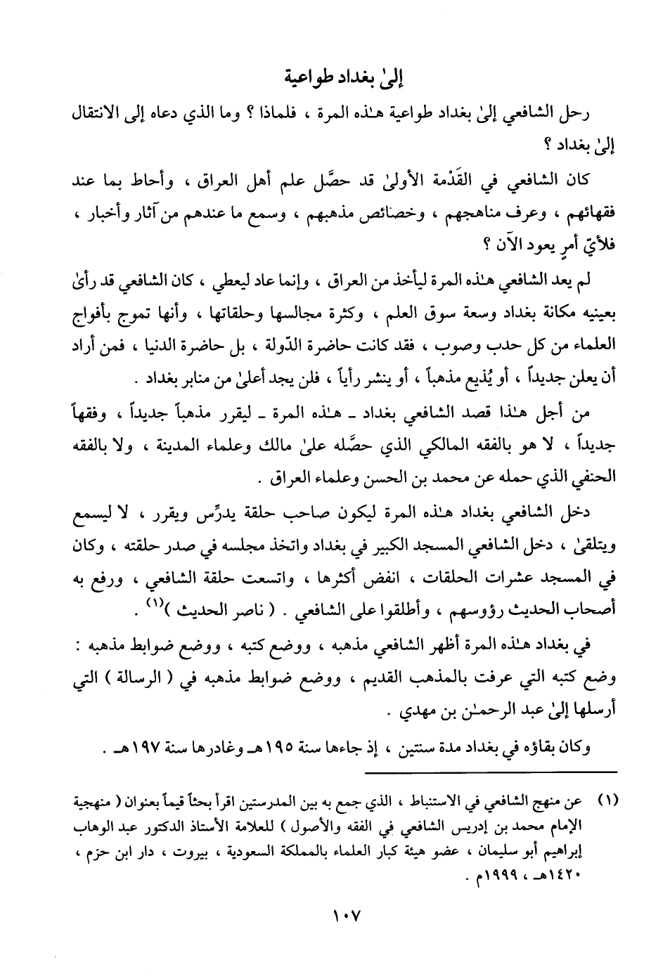 من أجل هذا قصد الشافعي بغداد -هذه المرة- ليقرر مذهباً جديداً، وفقهاً جديداً، لا هو بالفقه المالكي الذي حصَّله على مالك وعلماء المدينة، ولا بالفقه الحنفي الذي حمله عن محمد بن الحسن وعلماء العراق.