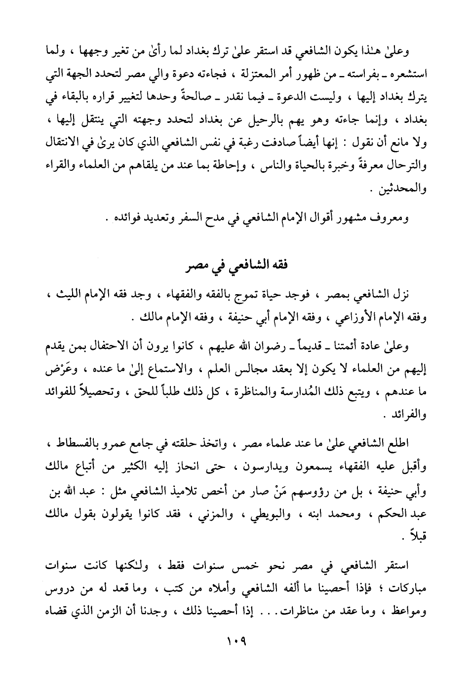 استقر الشافعي في مصر نحو خمس سنوات فقط، ولكنها كانت سنوات مباركات؛ فإذا أحصينا ما ألفه الشافعي وأملاه من كتب، وما قعد له من دروس ومواعظ، وما عقد من مناظرات ... إذا أحصينا ذلك، وجدنا أن الزمن الذي قضاه