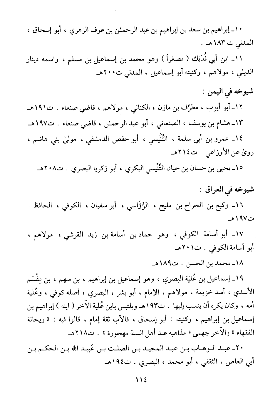 19 - إسماعيل بن عُليّة البصري، وهو إسماعيل بن إبراهيم، بن سهم، بن مِقْسَم الأسدي، أسد خزيمة، مولاهم، الإمام، أبو بشر، البصري، أصله كوفي، وعُلية أمه، وكان يكره أن ينسب إليها. ت 193 هـ ويلتبس بابن عُلية الآخر (ابنه) إبراهيم بن إسماعيل بن إبراهيم، وكنيته: أبو إسحاق، فالأب ثقة إمام، قالوا فيه: " ريحانة الفقهاء " والآخر جهمي " مذاهبه عند أهل السنة مهجورة ". ت 218 هـ