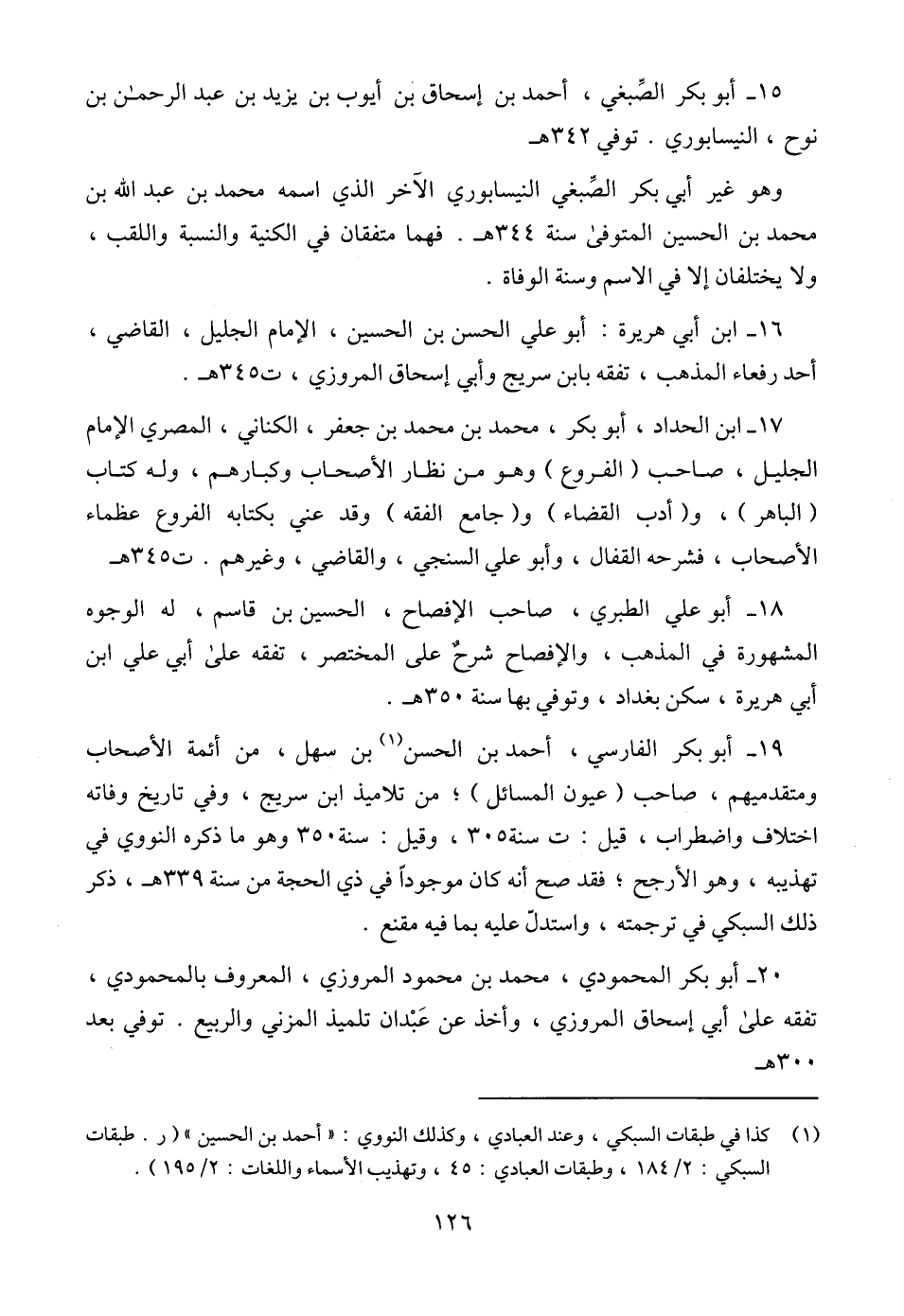 17 - ابن الحداد، أبو بكر، محمد بن محمد بن جعفر، الكناني، المصري الإمام الجليل، صاحب (الفروع) وهو من نظار الأصحاب وكبارهم، وله كتاب (الباهر)، و (أدب القضاء) و (جامع الفقه) وقد عني بكتابه الفروع عظماء الأصحاب، فشرحه القفال، وأبو علي السنجي، والقاضي، وغيرهم. ت 345 هـ