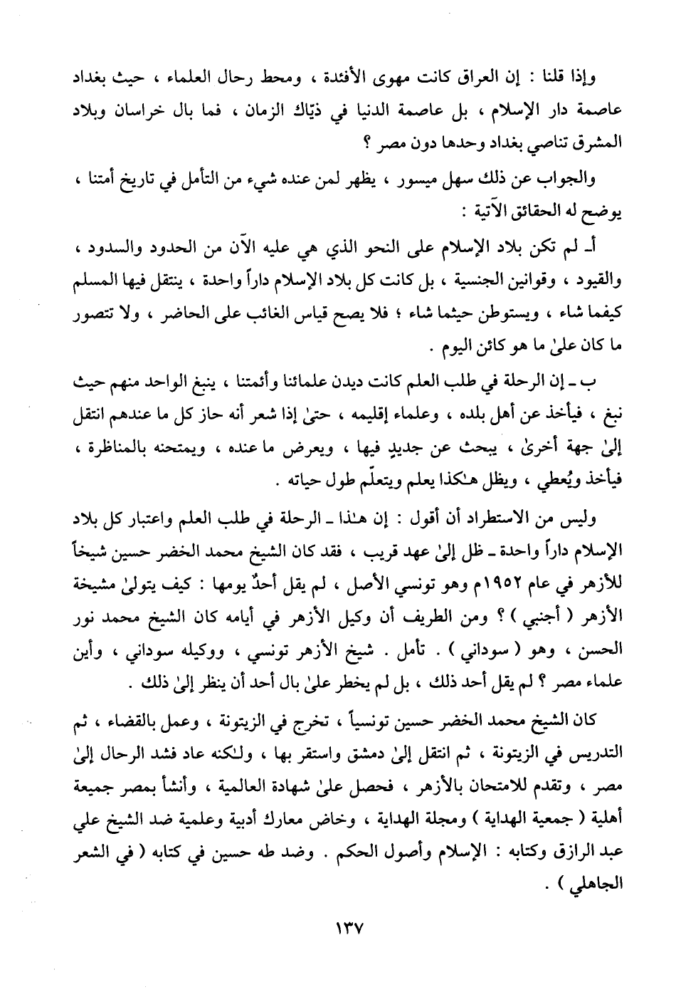 وليس من الاستطراد أن أقول: إن هذا -الرحلة في طلب العلم واعتبار كل بلاد الإسلام داراً واحدة- ظل إلى عهد قريب، فقد كان الشيخ محمد الخضر حسين شيخاً للأزهر في عام 1952 م وهو تونسي الأصل، لم يقل أحدٌ يومها: كيف يتولى مشيخة الأزهر (أجنبي)؟ ومن الطريف أن وكيل الأزهر في أيامه كان الشيخ محمد نور الحسن، وهو (سوداني). تأمل. شيخ الأزهر تونسي، ووكيله سوداني، وأين علماء مصر؟ لم يقل أحد ذلك، بل لم يخطر على بال أحد أن ينظر إلى ذلك.