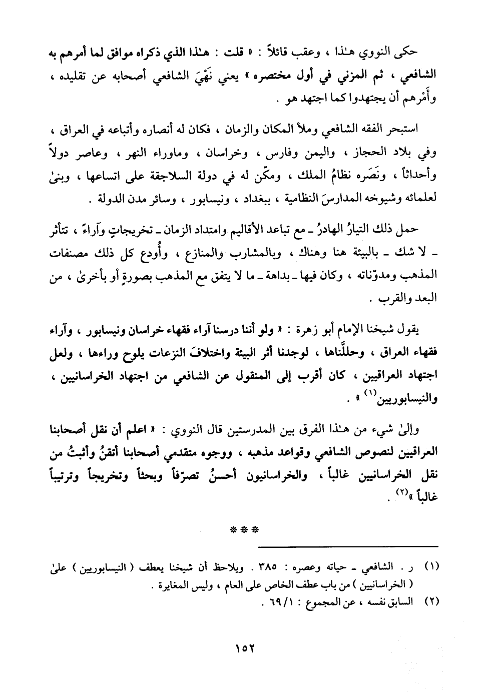 وإلى شيء من هذا الفرق بين المدرستين قال النووي: " اعلم أن نقل أصحابنا العراقيين لنصوص الشافعي وقواعد مذهبه، ووجوه متقدمي أصحابنا أتقنُ وأثبتُ من نقل الخراسانيين غالباً، والخراسانيون أحسنُ تصرّفاً وبحثاً وتخريجاً وترتيباً غالباً " (¬2).