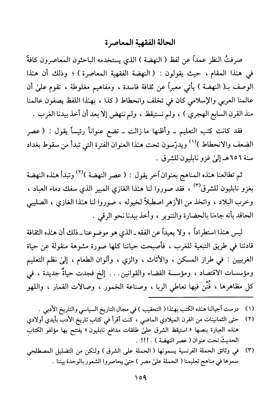 صرفتُ النظر عمداً عن لفظ (النهضة) الذي يستخدمه الباحثون المعاصرون كافة في هذا المقام، حيث يقولون: (النهضة الفقهية المعاصرة)؛ وذلك أن هذا الوصف بـ (النهضة) يأتي معبراً عن ثقافة فاسدة، ومفاهيم مغلوطة، تقوم على أن عالمنا العربي والإسلامي كان في تخلف وانحطاط (كذا، بهذا اللفظ يصفون عالمنا منذ القرن السابع الهجري)، ولم نستيقظ، ولم ننهض إلا بعد أن أخذ بيدنا الغرب.