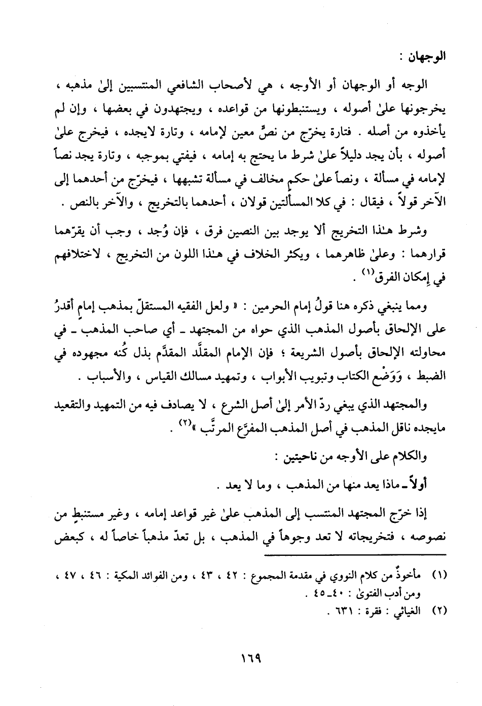 الوجه أو الوجهان أو الأوجه، هي لأصحاب الشافعي المنتسبين إلى مذهبه، يخرجونها على أصوله، ويستنبطونها من قواعده، ويجتهدون في بعضها، وإن لم يأخذوه من أصله. فتارة يخرّج من نصٍّ معين لإمامه، وتارة لا يجده، فيخرج على أصوله، بأن يجد دليلاً على شرط ما يحتج به إمامه، فيفتي بموجبه، وتارة يجد نصاً لإمامه في مسألة، ونصاً على حكم مخالف في مسألة تشبهها، فيخرّج من أحدهما إلى الآخر قولاً، فيقال: في كلا المسألتين قولان، أحدهما بالتخريج، والآخر بالنص.