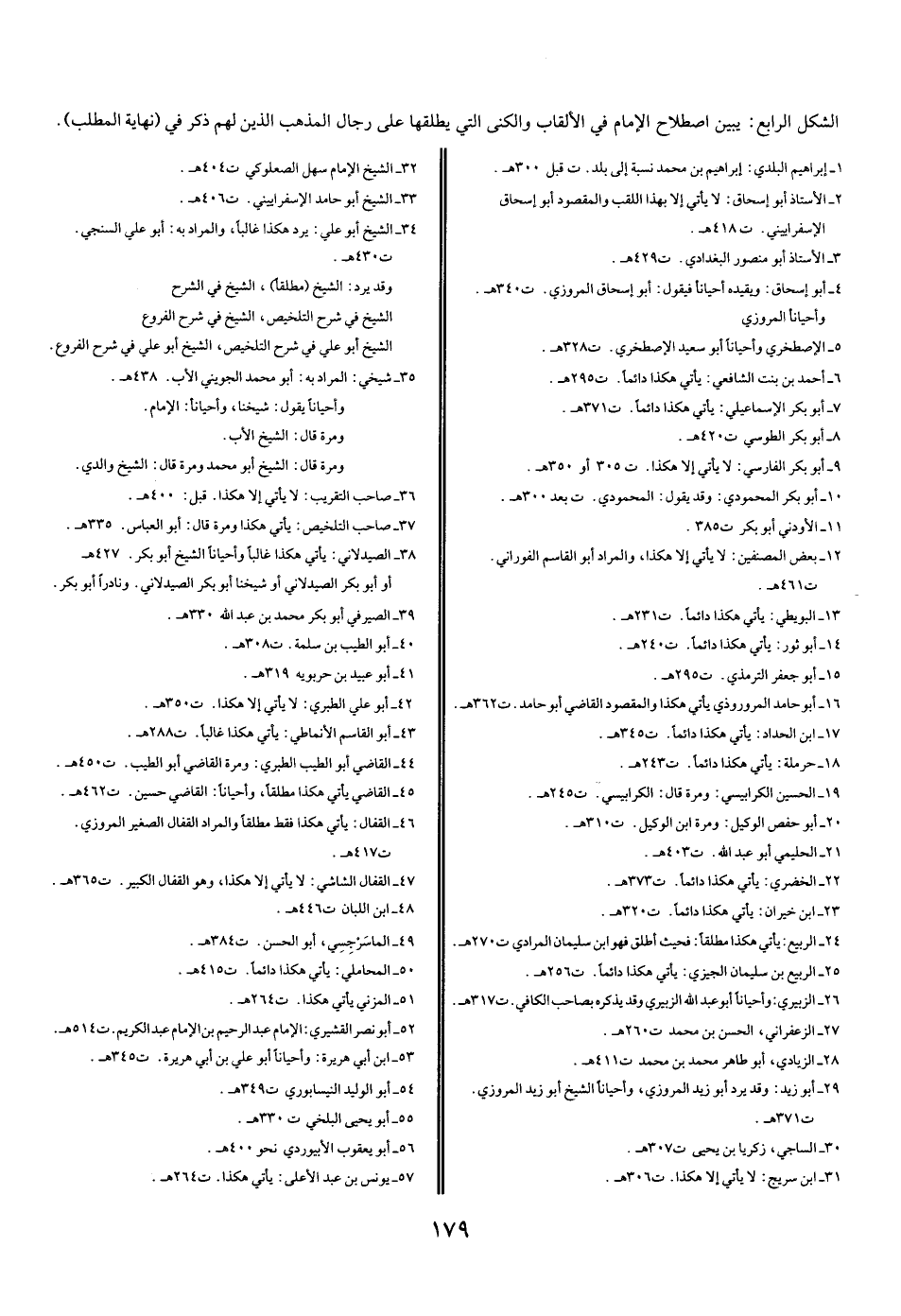الشكل الرابع: يبين اصطلاح الإمام في الألقاب والكنى التي يطلقها على رجال المذهب الذين لهم ذكر في (نهاية المطلب).