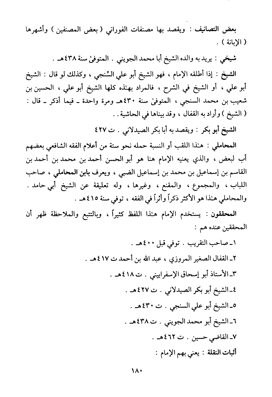 الشيخ: إذا أطلقه الإمام، فهو الشيخ أبو علي الجويني، وكذلك لو قال: الشيخ أبو علي، أو الشيخ في الشرح، فالمراد بهذه كلها الشيخ أبو علي، الحسين بن شعيب بن محمد السنجي، المتوفى سنة 430 هـ ومرة واحدة -فيما أذكر- قال: (الشيخ) وأراد به القفال، وقد بيناها في الحاشية ..