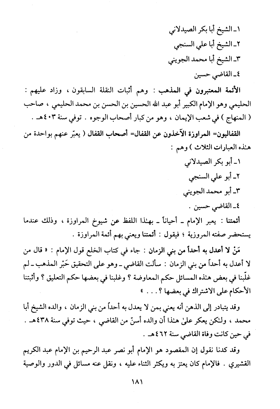 الأئمة المعتبرون في المذهب: وهم أثبات النقلة السابقون، وزاد عليهم: الحليمي وهو الإمام الكبير أبو عبد الله الحسين بن الحسن بن محمد الحليمي، صاحب (المنهاج) في شعب الإيمان، وهو من كبار أصحاب الوجوه. توفي سنة 403 هـ.
