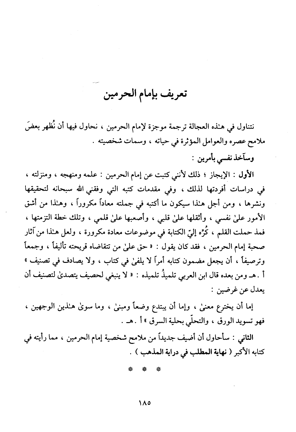 الأول: الإيجاز؛ ذلك لأنني كتبت عن إمام الحرمين: علمه ومنهجه، ومنزلته، في دراسات أفردتها لذلك، وفي مقدمات كتبه التي وفقني الله سبحانه لتحقيقها ونشرها، ومن أجل هذا سيكون ما اكتبه في جملته معاداً مكروراً، وهذا من أشق الأمور على نفسي، وأثقلها على قلبي، وأصعبها على قلمي، وتلك خطة التزمتها، فمذ حملت القلم، كُرِّه إلى الكتابة في موضوعات معادة مكرورة، ولعل هذا من آثار صحبة إمام الحرمين، فقد كان يقول: " حق على من تتقاضاه قريحته تأليفاً، وجمعاً وترصيفاً، أن يجعل مضمون كتابه أمراً لا يلفى في كتاب، ولا يصادف في تصنيف " أ. هـ ومن بعده قال ابن العربي تلميذُ تلميذه: " لا ينبغي لحصيف يتصدى لتصنيف أن يعدل عن غرضين: