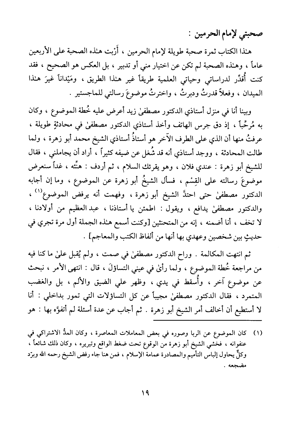 هذا الكتاب ثمرة صحبة طويلة لإمام الحرمين، أَرْبت هذه الصحبة على الأربعين عاماً، وهذه الصحبة لم تكن عن اختيار مني أو تدبير، بل العكس هو الصحيح، فقد كنت أُقدِّر لدراساتي وحياتي العلمية طريقاً غير هذا الطريق، ومَيْداناً غيرَ هذا الميدان، وفعلاً قدرتُ ودبرتُ، واخترتُ موضوعَ رسالتي للماجستير.